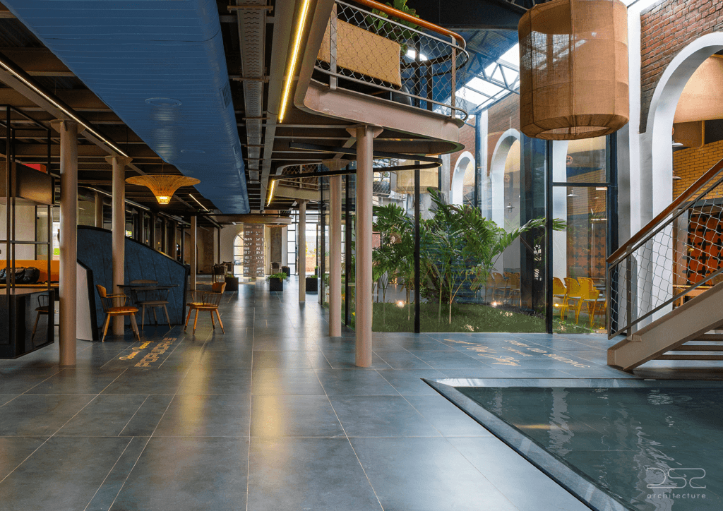 The architects approached spatial planning with the belief that “wastage should essentially be non-existent” not only in materials but also in space. Every gallery, quadrant, and transitional zone is fully utilised, resulting in fluid circulation and zero dead spaces. Spatial articulation remains central: open workstations, CEO cabins, a training room, boardroom, and collaborative areas all stitch together seamlessly around a central garden and mirror pool, the latter adding lightness and a contemplative rhythm to the industrial envelope.