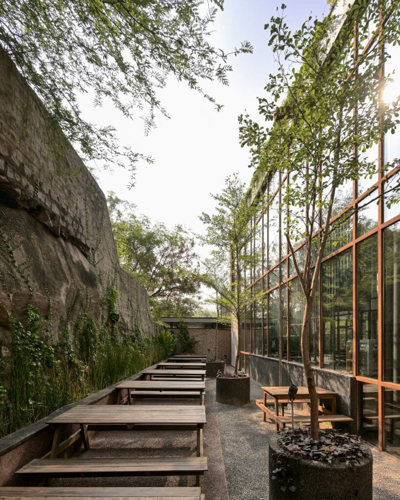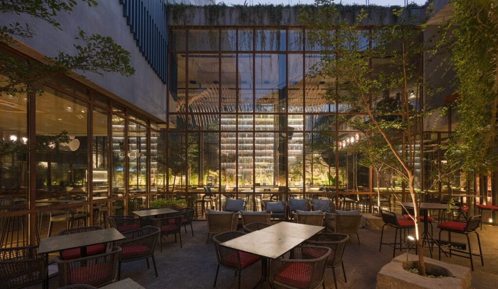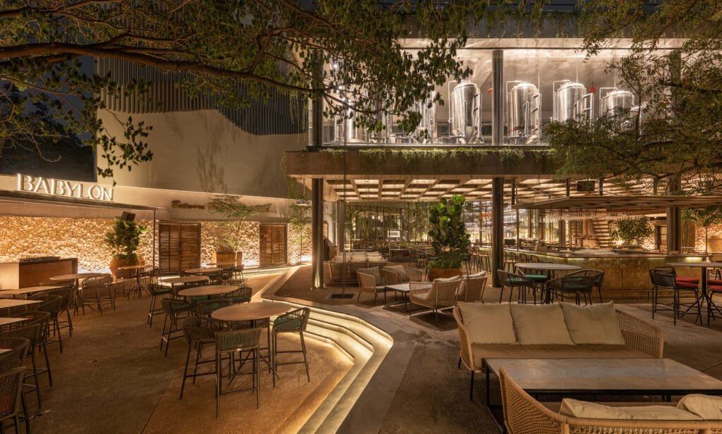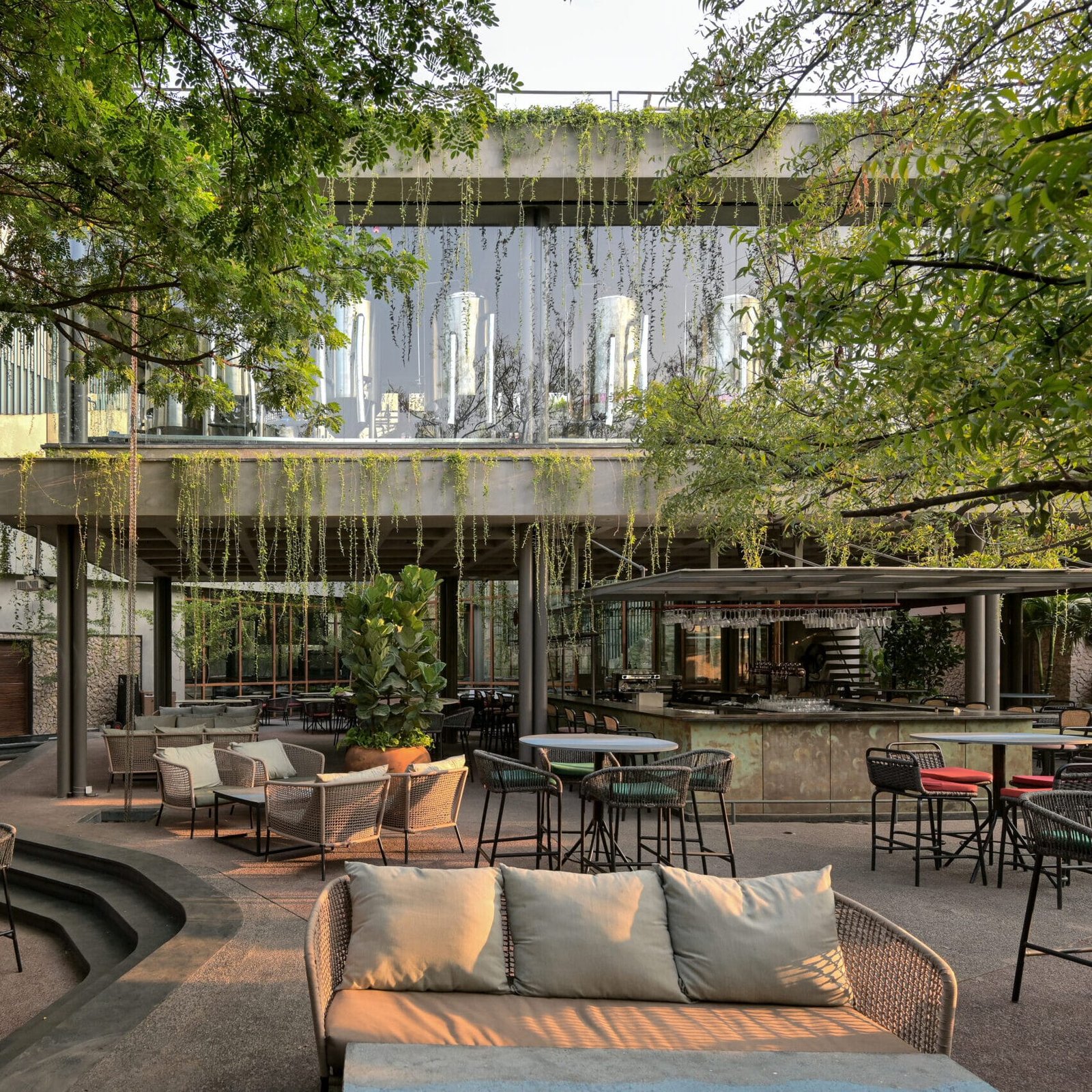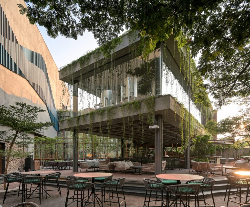 The semi-open areas are carefully planned around existing mature trees, allowing the natural canopy to shape shaded seating pockets and a relaxed ambience. Complementing the architectural intent, the landscape design by Kiasma Studio plays a key role in softening the built form and reinforcing the indoor–outdoor dialogue. This spatial sequence culminates in a central courtyard, where the brewery becomes the visual and experiential focal point, anchoring the project while animating the heart of the space.