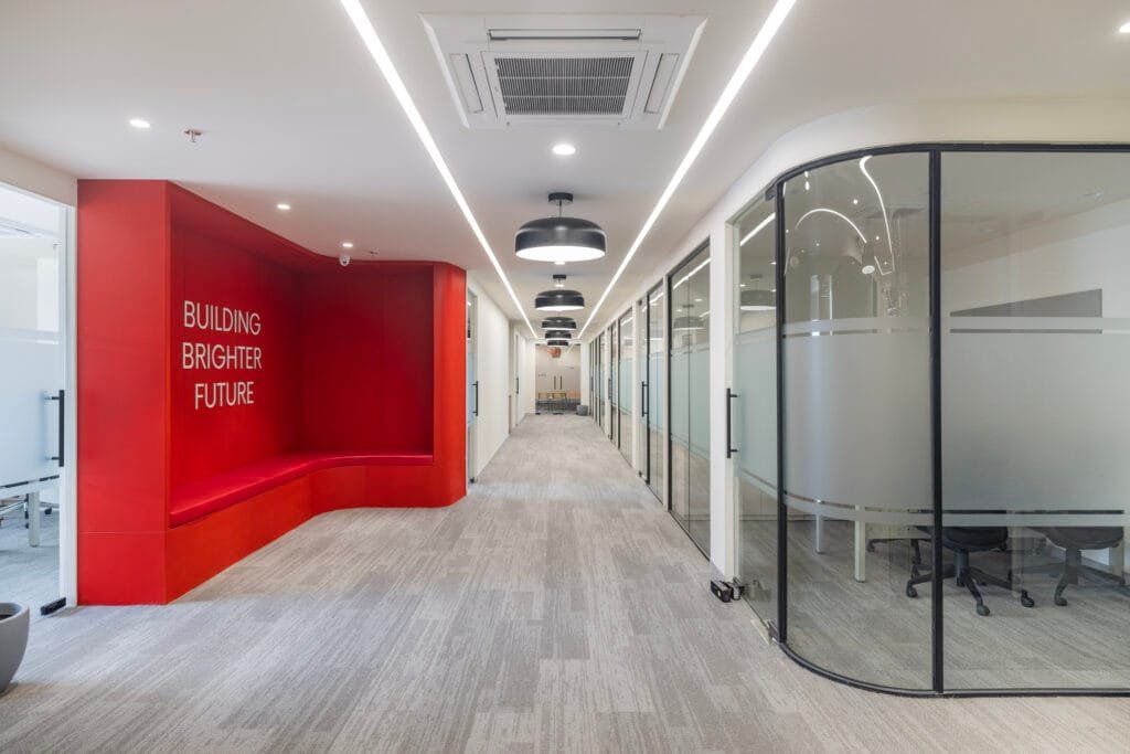 Materiality plays a central role in redefining the office’s industrial setting. A palette of muted neutrals—wood, grey, and white—forms the architectural base, allowing natural light to travel across surfaces. Within this compact setting, a single, decisive gesture introduces vibrancy: the company’s bold red brand colour. Instead of dispersing it throughout the office, Resaiki consolidated this energy into a single sculptural intervention, a breakout and waiting zone outside the director’s cabins. Entirely rendered in red, this space functions as a waiting lounge, informal discussion area, and collective address area where the directors can connect directly with their teams. The custom-built seating flows seamlessly from wall to floor, bending to form a continuous sofa and back panel, a tactile, architectural expression of unity and movement.