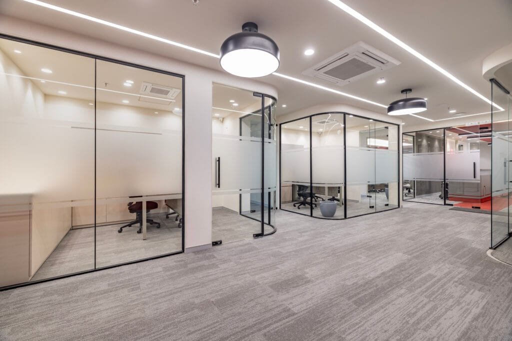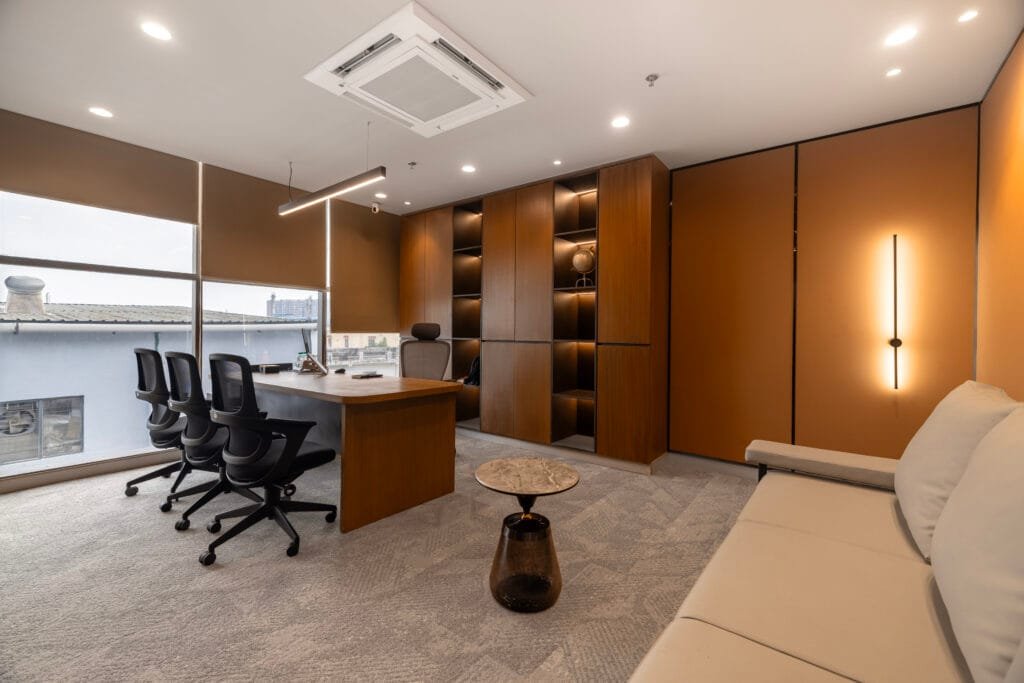 Throughout the office, lighting—unsurprisingly for a company that manufactures it—is layered and purposeful. Warm, even illumination defines work zones, while accent lights highlight product displays, turning the space itself into a living catalogue of Billtech’s expertise.