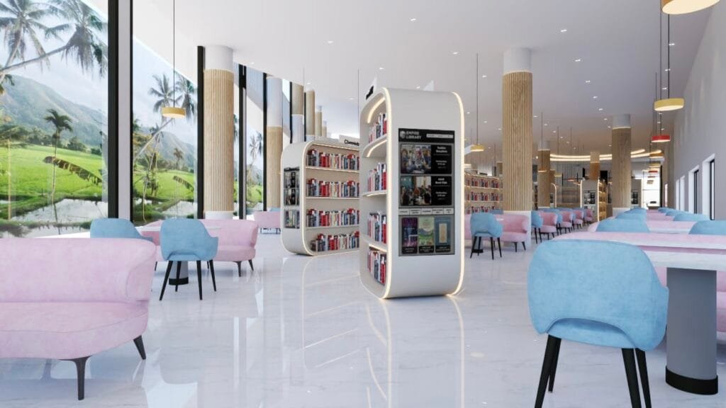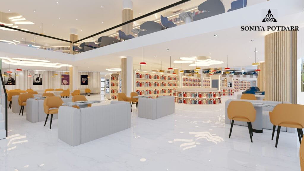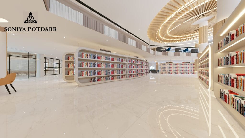 At the heart of the design is an intelligent integration of automation and user-centric innovation. Automated kiosks for book issue and return streamline circulation, while centralised light and temperature control systems ensure a comfortable environment throughout the day. Large, curved interactive LED screens anchor the double-height reception area, offering real-time library zoning, academic updates, and engaging visual content. Additional interactive display screens integrated within the bookshelves allow students to access information about the collection at a glance, enhancing the ease and efficiency of navigation. The spatial planning adopts a sensitive balance of neutrality and vibrancy. Soft grey, curved bookshelves, illuminated with understated profile lighting, define the visual rhythm of the library while adding sculptural fluidity. Each zone—undergraduate, postgraduate, faculty, research, and hostel—has been colour-coded subtly to create identity without overwhelming the calm palette. A dedicated digital research area, private study cabins, and a hostel-exclusive reading lounge ensure that the needs of every student community are addressed with precision.