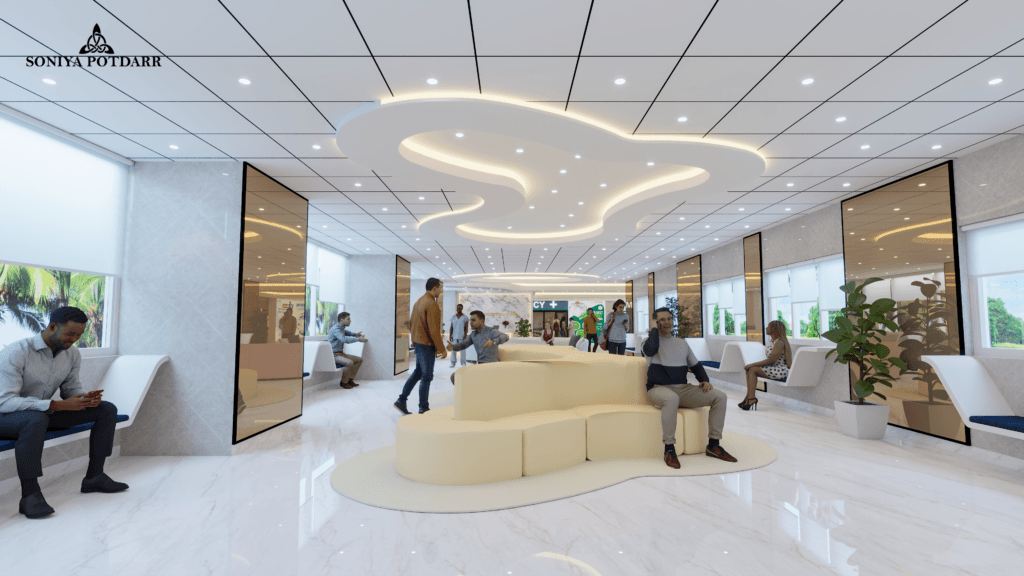 The lobby of this Super Speciality Hospital has been conceptualised as a transformative transitional space that redefines the typical experience of healthcare environments. The design brief posed a unique challenge due to the linear and narrow proportions of the site, prompting the need for a spatial strategy that could visually widen the corridor and introduce a sense of fluidity. In response, the central seating was envisioned as a sculptural installation composed of flowing curvature waves arranged in sets of three. This organically shaped configuration not only breaks the monotony of the elongated layout but also guides circulation naturally, encouraging smooth movement while creating pockets of comfort for patients and visitors. The ceiling echoes this same undulating form through a rhythmic feature of illuminated curves, establishing an engaging visual dialogue between the horizontal and vertical planes and lending the entire space an immersive sculptural character.