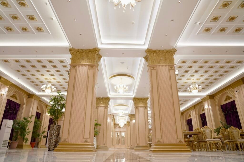 The interplay of gilded details with warm ambient lighting highlights the dramatic ceiling compositions and cascading chandeliers that embellish the space. Every element, from hand-crafted mouldings to customised seating, has been thoughtfully curated to create an atmosphere of regal sophistication, making the lobby not merely an entrance but an immersive gateway to the palatial world within. Continuing this narrative of grandeur, the Jasper Banquet and Sapphire Banquet stand as expansive venues designed to host celebrations with unmatched theatricality. These ballrooms draw heavily from the Baroque tradition of layered ornamentation—featuring elaborately patterned ceilings, gently fluted columns, richly textured wall treatments and lush plum drapery that heightens the drama of the space. The spatial planning is crafted to accommodate large gatherings without compromising intimacy, and the careful orchestration of lighting, symmetry and mirrored surfaces adds a ceremonial quality to the environment. These banquet halls elevate every event into an artistic experience, capturing the romantic elegance of European palaces while integrating the functionality demanded by contemporary hospitality.