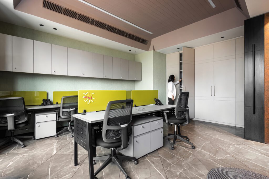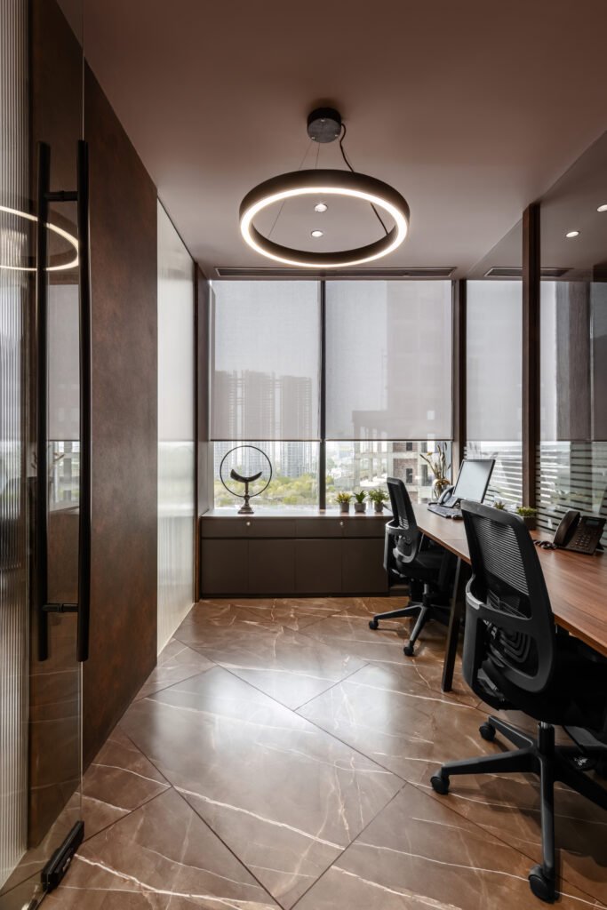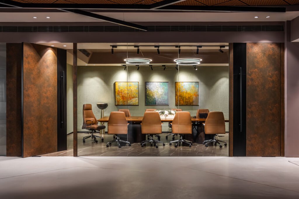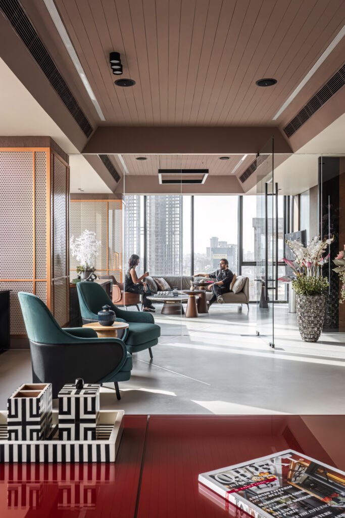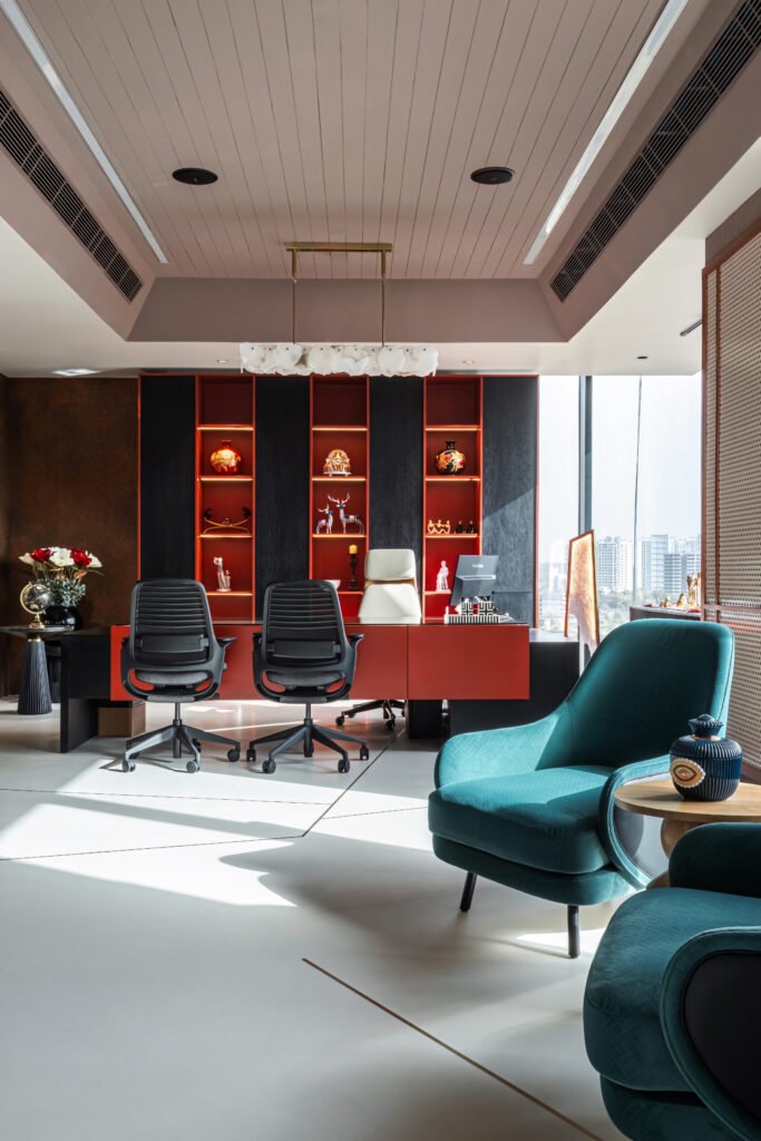 The lounge-cum-reception leads one to the Managing Director’s cabin, through a solid copper door. Which has an ensuite recreational room and a powder toilet. Red accents punctuate this space, adding a note of power and warmth.