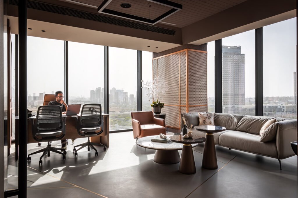 Custom Design Stories, a disruptive architecture and interiors studio led by Aditya Tognatta and Ananya Sharma, has desgined a distinctive 3,630 sq ft office space in Gurugram’s Magnum Global Park. The project, designed for a prominent business promoter, is defined by its bold use of copper as a key element. With nearly 40 per cent of the area dedicated to the promoter’s cabin and private lounge, the workspace foregrounds personalisation and spatial drama as its core ideas. It is built to express stature and intent.