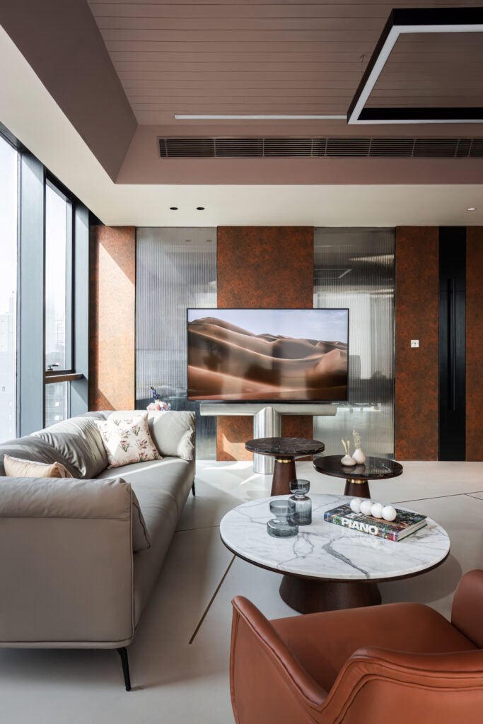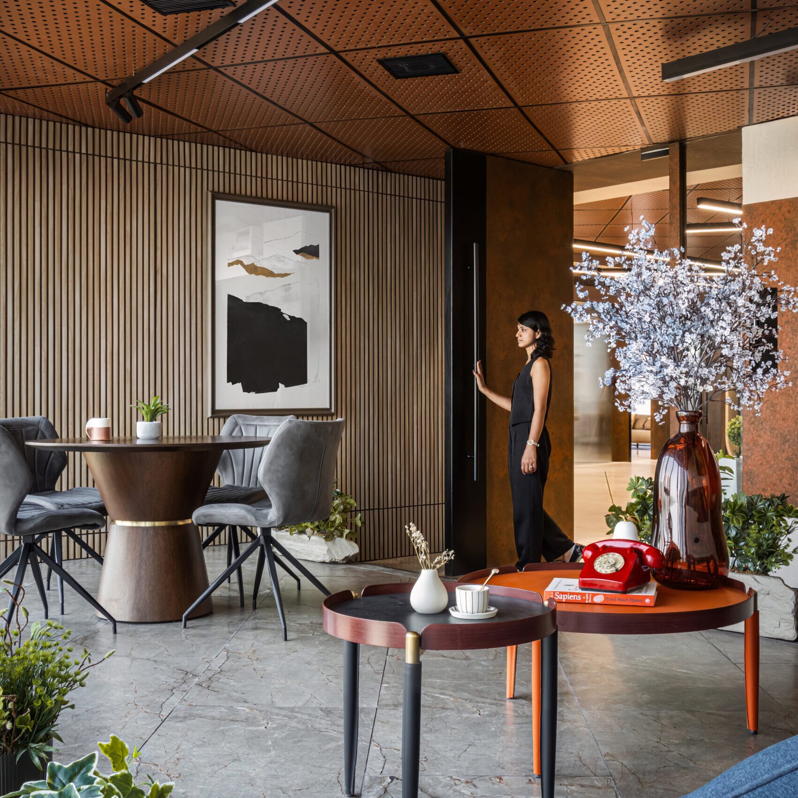 Despite the scale of the project, the design embraces custom detailing at every turn. Rugs were developed through long-standing collaboration with the local vendors. Elements like fluted wall intersections and transitions in flooring have been carefully integrated into the spatial narrative. Patterns on the floor and ceiling align at angles rather than following traditional grids to create tension and intrigue. These design decisions testify to the Copper Tilt as being a workspace that demands to be remembered not for its excesses, but for individuality, intent and the dare to go beyond conventions.