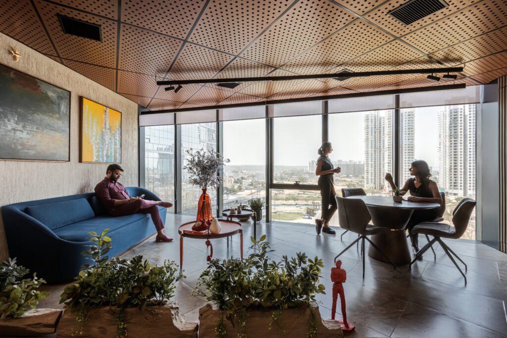 At the heart of the office is the central lounge, which also serves as the social space. This is where most visitors are received, rather than being ushered directly into the cabin. Flanked by a liquid metal wall and punctuated with bespoke furniture, this lounge forms the primary point of engagement within the office. Here, the designs’ assertiveness becomes evident. The flooring pattern and the ceiling, laid diagonally instead of the conventional rectilinear, nod to the office’s name: A Copper Tilt. This deviation from the norm wasn’t merely an aesthetic choice, rather, it was born out of the need to address a sharp, acute angle corner that the floor plate came with. It results in a space that feels dynamic and assertive, mirroring the confidence of the enterprise it supports.