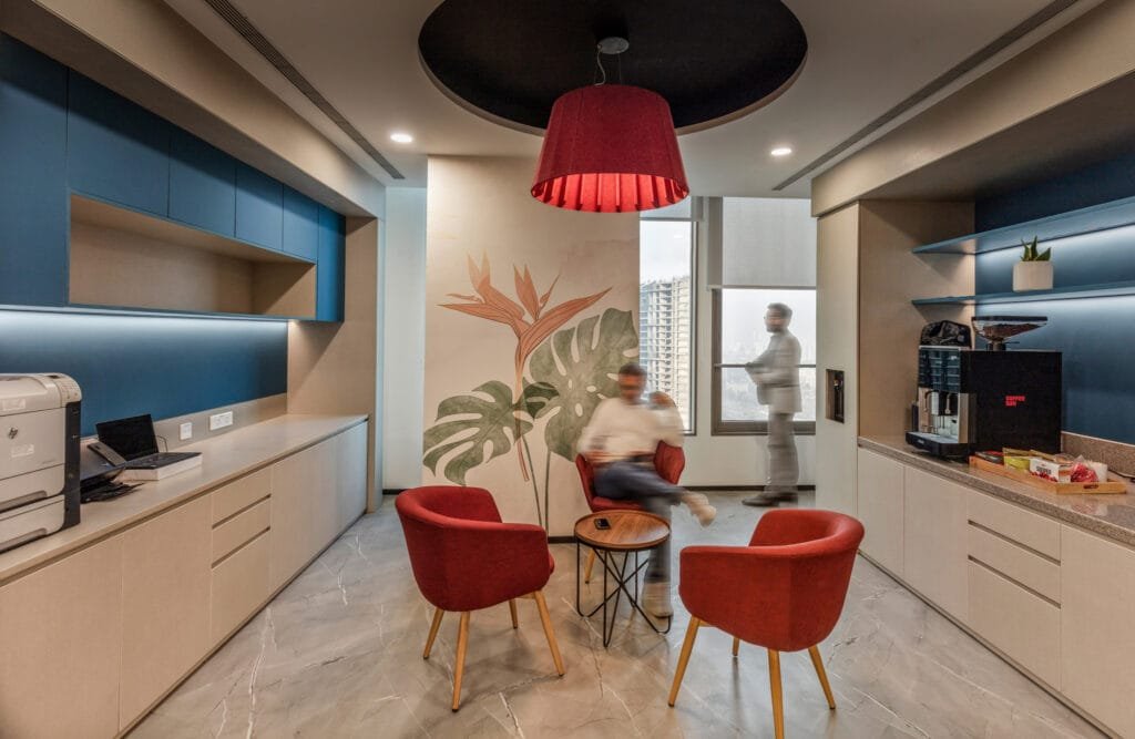 The reception is a calm and elegant welcome area with marble and veneer finishes that sets the tone of trust and professionalism. Open and daylight-rich spaces for associates and support teams with ergonomic seating for everyday comfort defines the workstations, while the partner cabins prioritize confidentiality and focus, featuring smart glass, acoustic insulation and curated artworks.