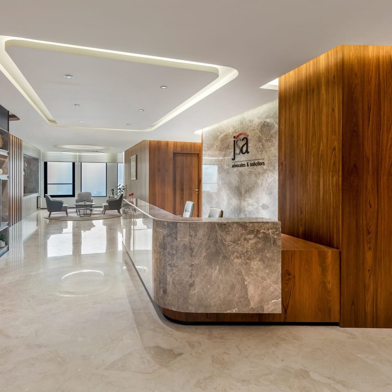 The idea was to design a workplace that felt both rooted in tradition and effortlessly contemporary.” She further adds, “The design became an extension of JSA’s brand ethos. Every element from the art and colour palette to the materials, reflects their professionalism and poise. Deep navy tones, white marble and natural wood come together to express trust, clarity and quiet confidence. The result is a space that mirrors JSA’s stature yet feels approachable and human.”