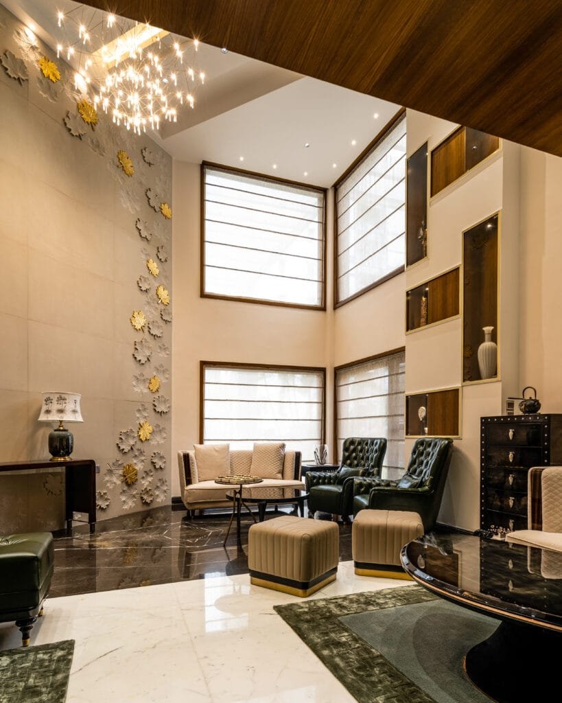 The entrance unfolds into a dramatic double-height foyer, immediately establishing a sense of scale and material richness. Stone cladding envelops the walls and floors, lending the space an almost industrial gravitas, while a large natural veneer false ceiling anchors the composition overhead. From here, visual connections extend into the dining hall, reinforcing openness and continuity.