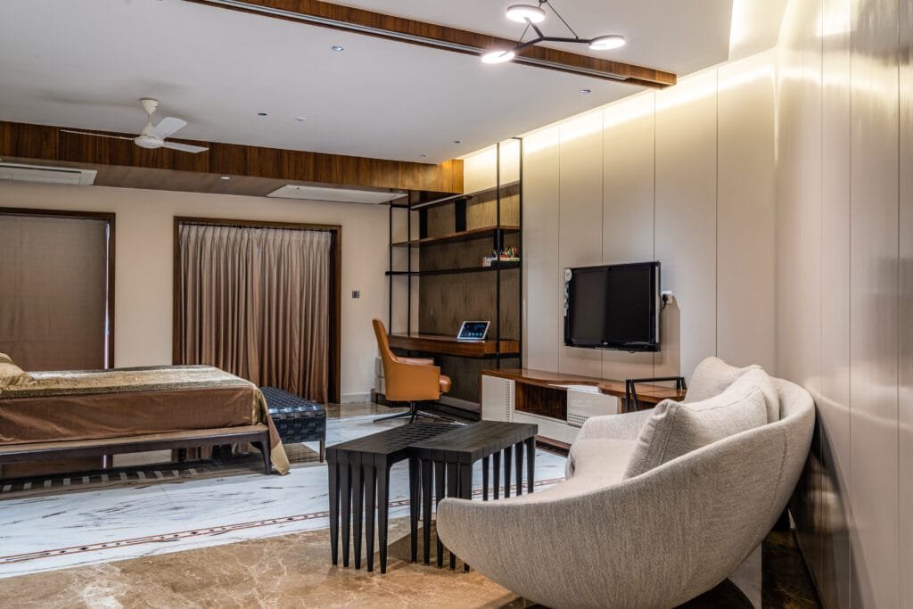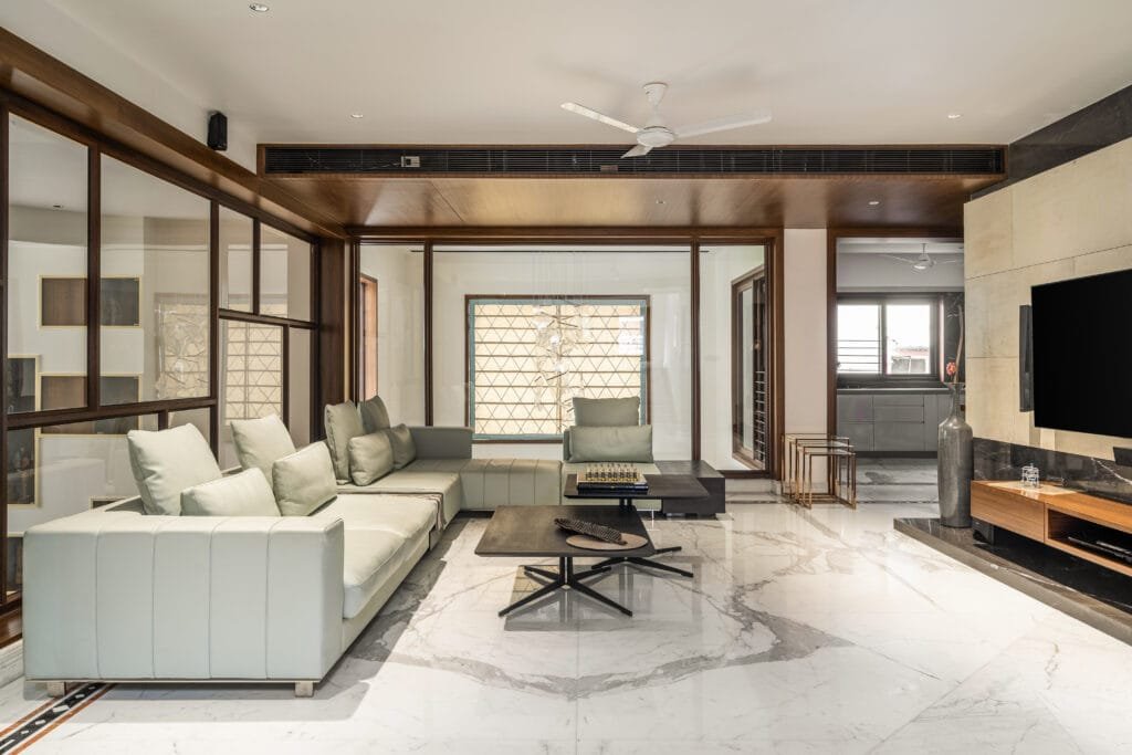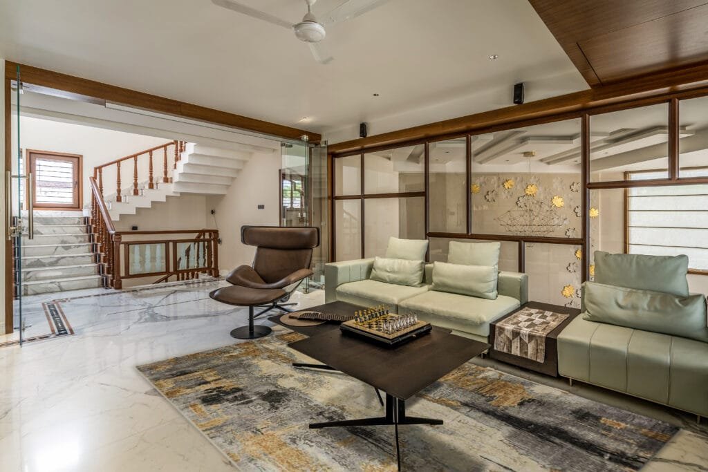 A conscious effort was made to reuse existing materials wherever possible. Much of the marble and teak wood from the original house has been repurposed and recombined, significantly reducing the project’s carbon footprint while adding layers of memory to the new interiors.