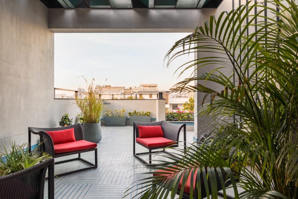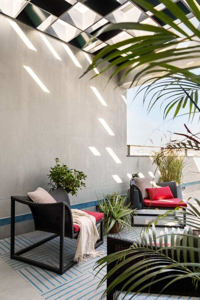 On the second floor, a custom-fabricated metal pergola introduces another unique design moment. Comprising angled metal plates in soft, sky-like tones, the pergola adds a feeling of lightness and openness. It transforms the terrace into a tranquil escape ideal for unwinding, socializing, or simply enjoying the breeze.