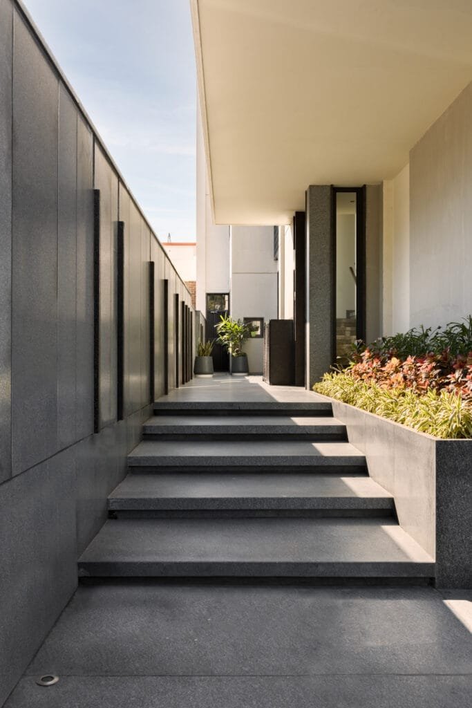 Materiality plays a significant role in enhancing the design’s visual and tactile appeal. Brick, concrete, glass, and metal form the core structural palette. The façade is rendered in exterior-grade textured paint, with black MS plate detailing that adds personality and modern character to the elevation. A standout feature at the entry is a sculptural installation of 60mm-thick Indian black granite verticals along the boundary wall, positioned like tall candles leading to the main door.