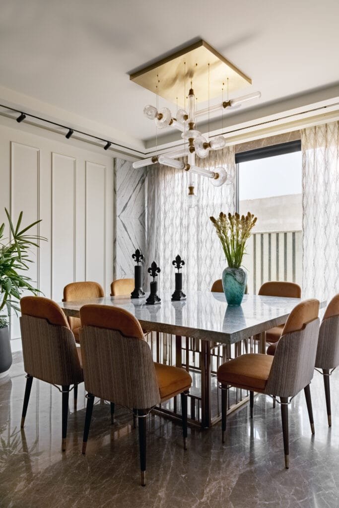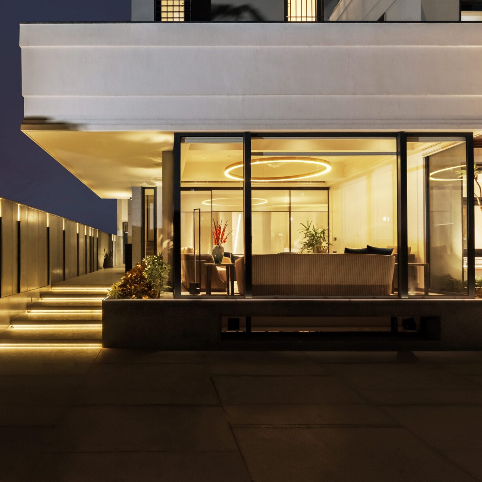 A consistent design language is carried across the interiors. Terrazzo flooring is used for the two terraces on the first and second floors. It subtly references square geometries and adds rhythm without overpowering the clean aesthetic. The colour scheme remains deliberately understated. A timeless grey-and-white palette is used throughout, punctuated with bold black metal details that give the home its strong, modern character. Lighting becomes an essential part of the spatial experience: large double-height glazing, C-shaped glass on the façade, custom 8-foot circular drop lights, and dramatic chandeliers are thoughtfully placed to bring in both daylight and ambient glow.