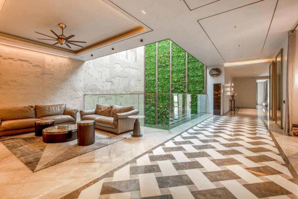 Adjacent lies the dining area, following the same neutral theme with luxe accents. It features a marble tabletop complemented with sleek and bespoke chairs. Additionally, with linear wall panelling designs and brass accents, the space imbues a sense of glamour and style. A captivating statement fixture atop casts a bright glow over the dining area, adding to the opulent charm of the area. One console is crowned with a decor piece inspired by a falcon, accented with red embellishments and a white backlit design, creating a bold focal point. Further, the lobby area around the staircase captures the attention with textured wall designs, defining the double height of the space. This is complemented by a huge green wall topped by a skylight, manipulating the microclimate of the space while adding an aesthetic element to the design.