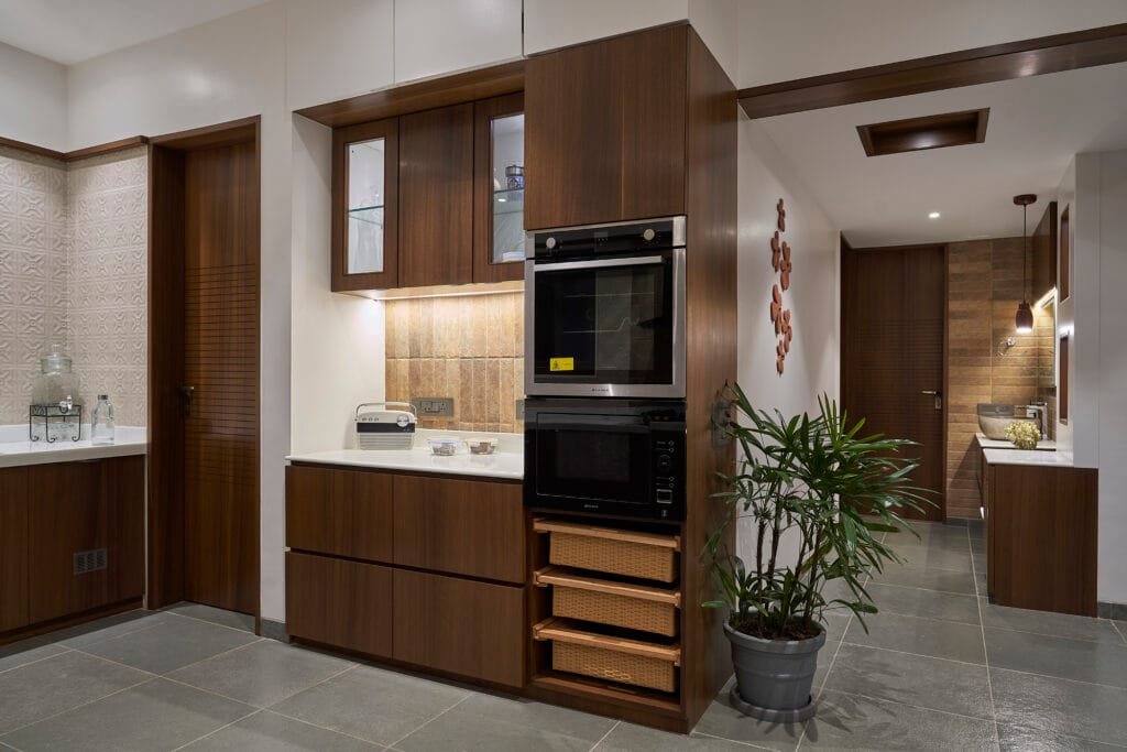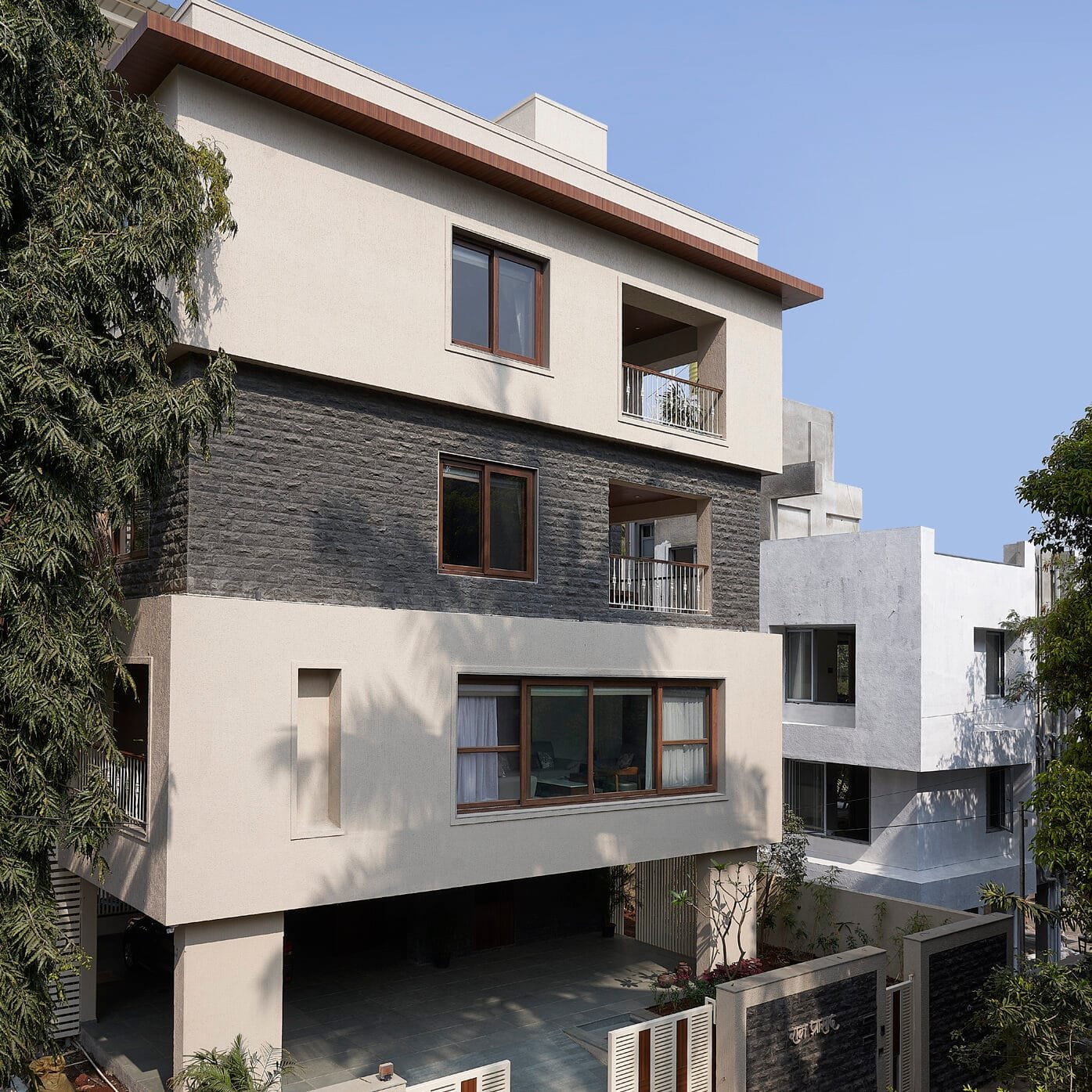Sharing the design brief, Ketan says, “Our clients who work in the automobile sector sought an environment that feels open and effortless. They have 3 kids, so they wanted to have a floor plate of same size on all three floors which can be converted later into three separate tenements, but wanted it to be currently used as a complete single tenement bungalow with 5 Bedrooms, kitchen, dining, living & Home theatre. Located at Sahakarnagar, there is interestingly, a difference of almost eleven feet between the two parallel roads abutting opposite sides of the plot. We took advantage of this to provide two level parking. On the first floor, the living dining and kitchen enjoy plenty of natural light. Two bedrooms occupy the second floor and the master bedroom is on the third floor. The basic science of directions has been followed, with respect to windward planning, ensuring the kitchen gets fresh morning sun.