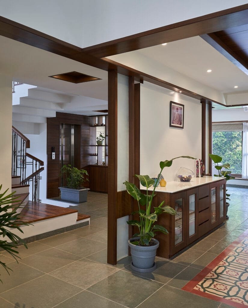 Most parts of the home have leather texture Kotah flooring with some parts in patterned flooring tiles. “I wanted to have an earthy still contemporary look to the house. So, we have used the Leather finish Kota stone flooring all over the home in combination with handmade cement tiles and Bharat tiles. The Folded plate staircase is covered with wood, while wood is also used for staircase tread with cast iron railing & wooden handrail on top. The Palette is kept very simple with single tone veneer, Kota flooring & Basalt stone for cladding”, informs Ketan. The architect is a stickler for the „discipline in design‟. Hence, he will never indulge in contrived tactics. For example, balustrades and railing details follow meticulous working drawings that create authentic old world charm in conjunction with the folded plate slab that also throws shadows all day long. In another instance, collages and photographs of the family have been made into a composition that sits pretty within a wooden „frame‟. It is a lovely idea that becomes a conversation starter and also a feature in the home. This and umpteen other features ensure this is a home that is truly timeless not only in the design way but also in allowing banks of memories stored away safely in every corner of its charm and aura. Throughout ‘Ramprasad Bungalow’, the collaboration between the client and design team manifests in unison. The resultant abode is one that translates experiences and aspirations into a milieu of ease and belonging.