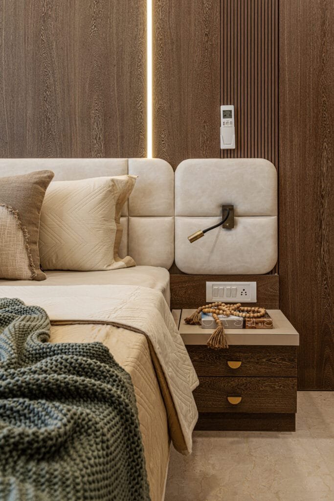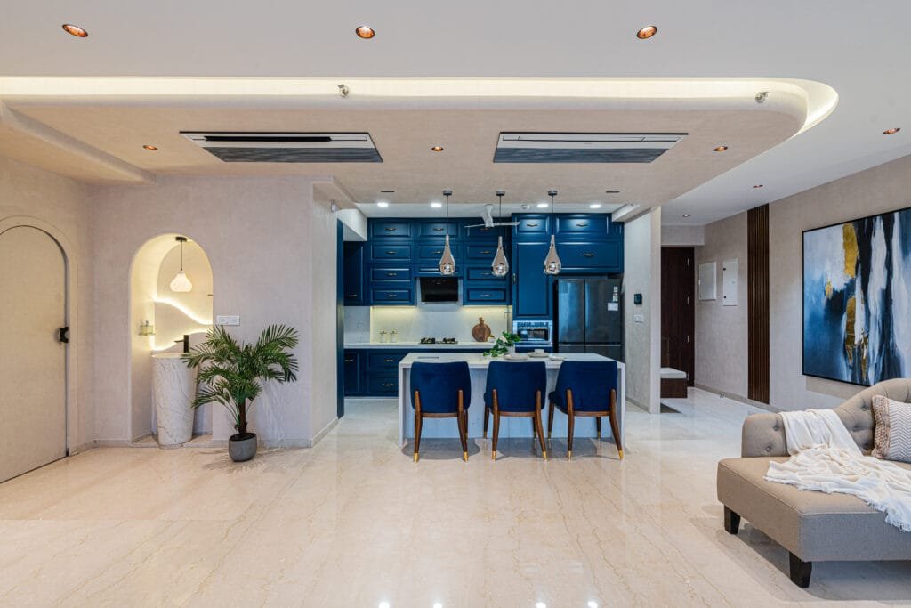 For this 3 BHK home transformation, the clients approached SK Design Studio with clear expectations and a desire for unique, well-planned interiors. Sharing the clients brief, Sarika, says, “They wanted a spacious, welcoming living room featuring a beautiful jhula as the focal element—something traditional yet modern. Their vision for the kitchen was equally specific: a blue-themed modular kitchen that felt refreshing, functional, and stylish.” Blue being a versatile color adds sophistication, tranquility, and character to this kitchen. This colour exudes elegance and works beautifully in lending a modern and traditional feel. SK Design Studio meticulously customized every corner of the home to match these requirements. From designing the blue kitchen with smart storage to creating an airy living space with the jhula, and crafting bedrooms with unique themes, the team ensured every detail aligned with the client’s preferences. “The result is a thoughtfully curated home where functionality meets creativity—an inspiring space tailored completely to the client’s lifestyle”, says Jeetendra. The dining area continues the narrative of understated luxury. Here, Dining Chairs blend sculptural grace with ergonomic comfort, encouraging lingering conversations and unhurried meals. The master bedroom has been designed as a tranquil sanctuary dressed in subtle richness. Upholstered headboards and plush bedding invite moments of calm. Beige-toned fabrics in linen envelop a soothing experience, layered thoughtfully with throw cushions in subtle patterns. The furniture sits low, in warm neutrals creating a meditative zone while allowing the craftsmanship to quietly shine through. “In the other bedrooms, the clients were looking for distinctive and attractive designs—something different from conventional layouts. They wanted each room to have its own personality while ensuring maximum comfort and usable space. Storage, openness, and customized detailing were key priorities”, informs Sarika.