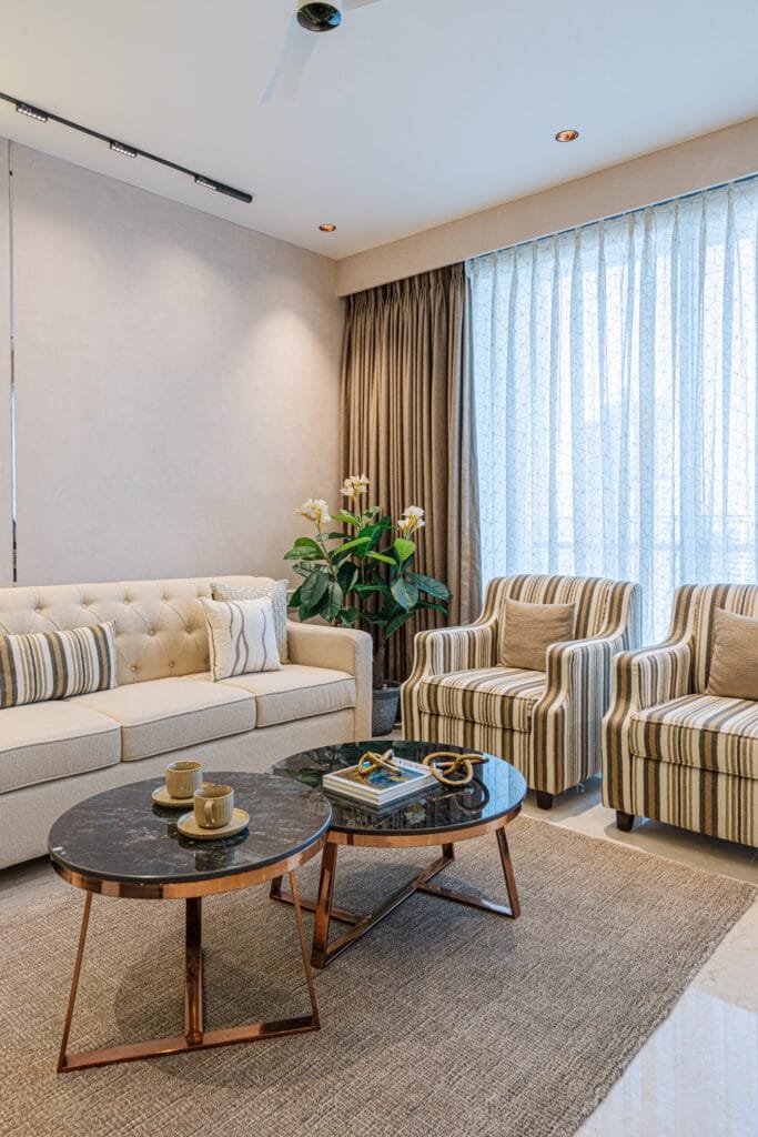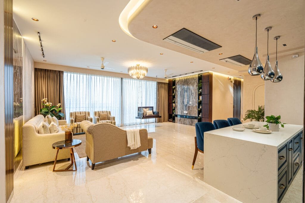 This apartment at Oberoi Enigma, Mumbai, designed by Sarika of SK Design Studio is a unique endeavour blending bespoke and hallmark luxury. Spread across an area of 1375 sq.ft. the 3 BHK home marries contemporary elements with classical touches. The design of this residence exemplifies a modern Indian contemporary style enriched with beautiful traditional elements. Founded in 2017 in Thane, SK Design Studio has emerged as a trusted name in interior design, known for converting everyday spaces into aesthetically refined and functional environments. At SK Design studio, we strongly believe that great design can elevate the way people feel and live. Every project is approached with personalization, attention to detail, and a commitment to delivering designs that truly reflect the client’s lifestyle and aspirations. At the heart of SK Design studio’s creative direction is our Chief Architect and Interior Designer, Sarika. With over 20 years of experience, she has shaped numerous homes across Mumbai and beyond with her minimal, modern, and thoughtful design sensibilities. Ensuring flawless execution is Jeetendra, Head of Projects at SK Design Studio. With a background in engineering, IT and project management, he brings technical expertise, discipline, and transparency to each project. Jeetendra ensures seamless communication between clients, designers, and on-site teams, enabling smooth workflows and timely completion. His experience in executing over 100 projects makes him a strong pillar of the organization.