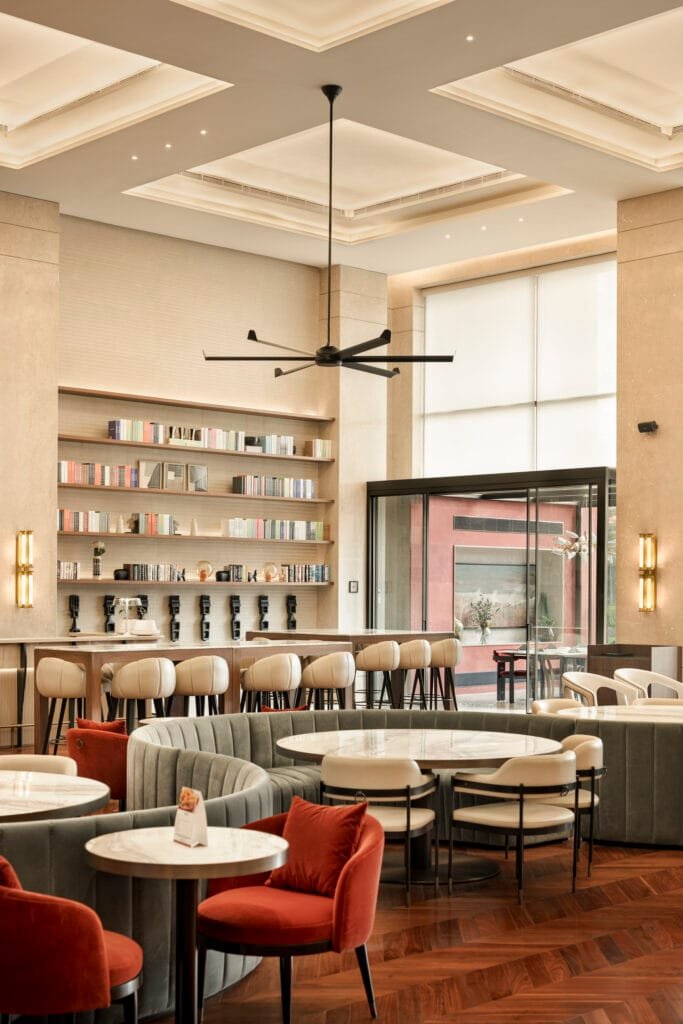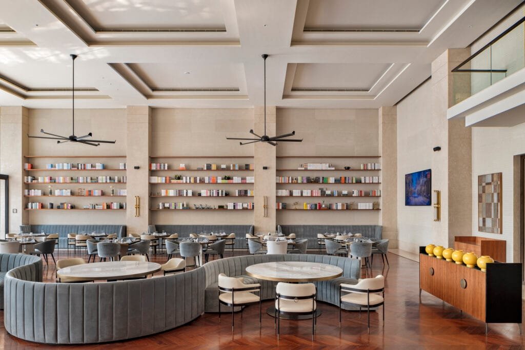 Creating a sense of continuity throughout the spaces, the expansive ceiling of the double-height Living Room on the ground floor fosters openness and grandeur. At the same time, the mezzanine balcony offers a dynamic vantage point overlooking the restaurant below. This strategic use of verticality enhances the spatial experience, ensuring a feeling of connectivity across different levels of the clubhouse. The business centre on the mezzanine floor further accentuates this sense of continuity. Carpeted throughout, the space blurs the boundary between the club’s social and professional functions, creating an environment that seamlessly adapts to both leisure and work. This thoughtful approach reflects the evolving needs of a modern, elite clientele, providing a multifunctional area that accommodates both relaxation and productivity.