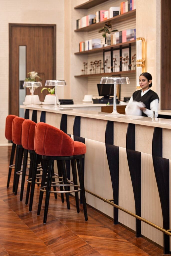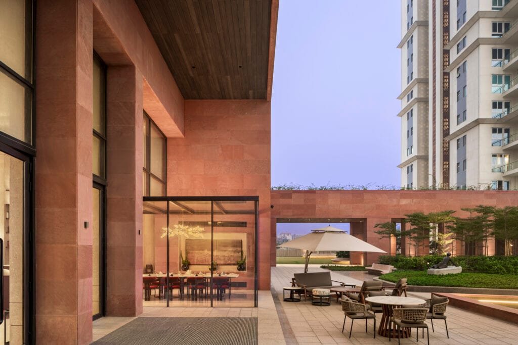 The design incorporates an earthy material palette that complements the exterior. The careful placement of art pieces maintains a timeless luxury while evoking a speakeasy’s intimate, secretive vibe. This layered material palette contrasts the red sandstone exterior, balancing elegance with a grounded, textured quality. Sculptures by Mukul Goyal that look towards the sky on the outdoor seating area overlooking the water feature add cultural and visual depth to the space.