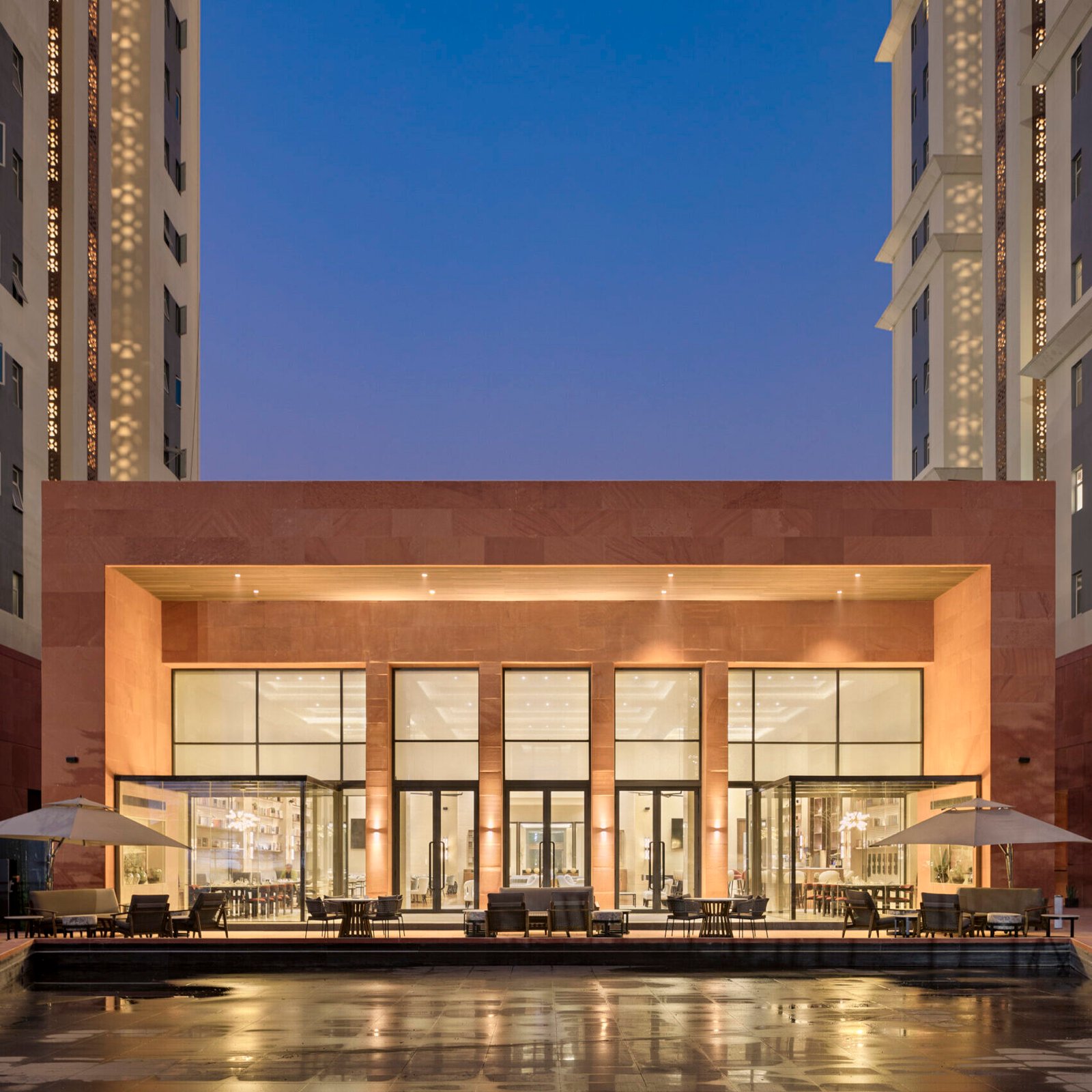 The design incorporates an earthy material palette that complements the exterior. The careful placement of art pieces maintains a timeless luxury while evoking a speakeasy’s intimate, secretive vibe. This layered material palette contrasts the red sandstone exterior, balancing elegance with a grounded, textured quality. Sculptures by Mukul Goyal that look towards the sky on the outdoor seating area overlooking the water feature add cultural and visual depth to the space.