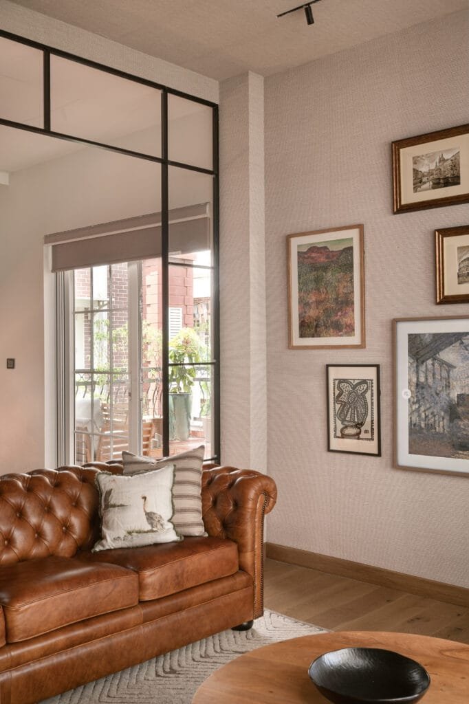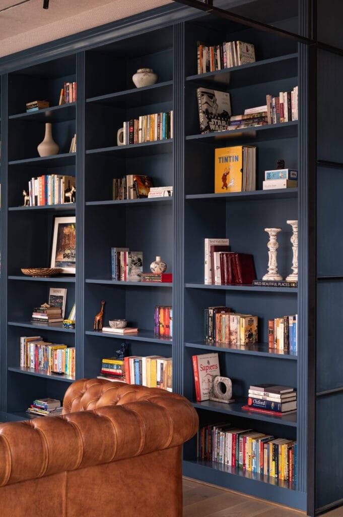 As we move up the stairs on the lower level is the guest bedroom with a large tropical mural papered wall behind a cane back bed. The classic French country cane and wood bed feels at home against the nature-inspired wall mural. On the first floor the stairs open into the family space featuring a grasscloth wallpaper that covers the entire family room and a wall-to-wall built-in library unit in a deep smoky blue-gray tone. A leather Chesterfield and a swivel chair ground the entire space. This level also sports three other bedrooms and bathrooms, including the master bedroom, kids’ bedroom and a guest room.
