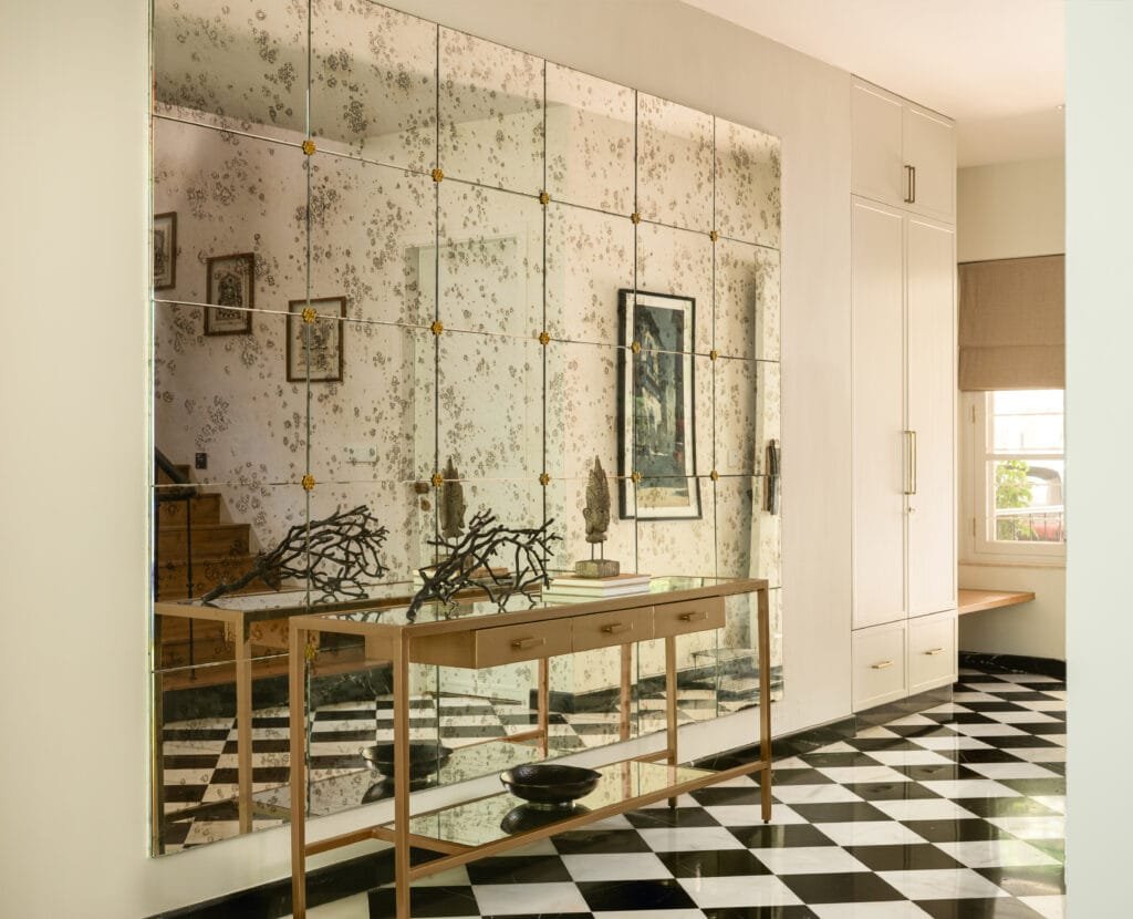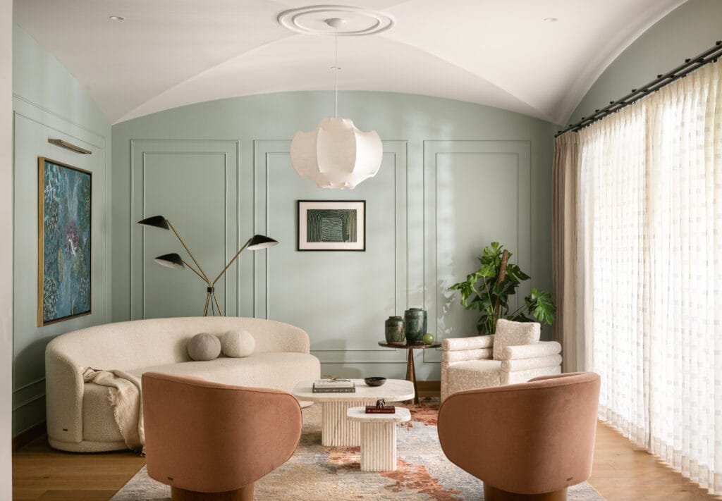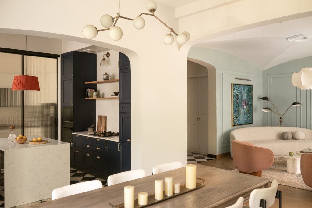 The home opens into a large foyer area featuring a classic harlequin marble floor and a foyer table in front of a wall clad in antique mirror. A soft archway leads into the living room, sporting soft teal walls all over. A curved sofa sits below a custom art piece by artist Priyanka Aelay and upholstered swivel chairs and classic fluted marble tables bring together the space. The living space has a vaulted ceiling that complements the arches. The dining and curved fluted bar area adjoining the living space is clad in a soft watercolour mural paper and sits next to the kitchen,n where deep navy cabinetry and a stone-topped island ground the space.