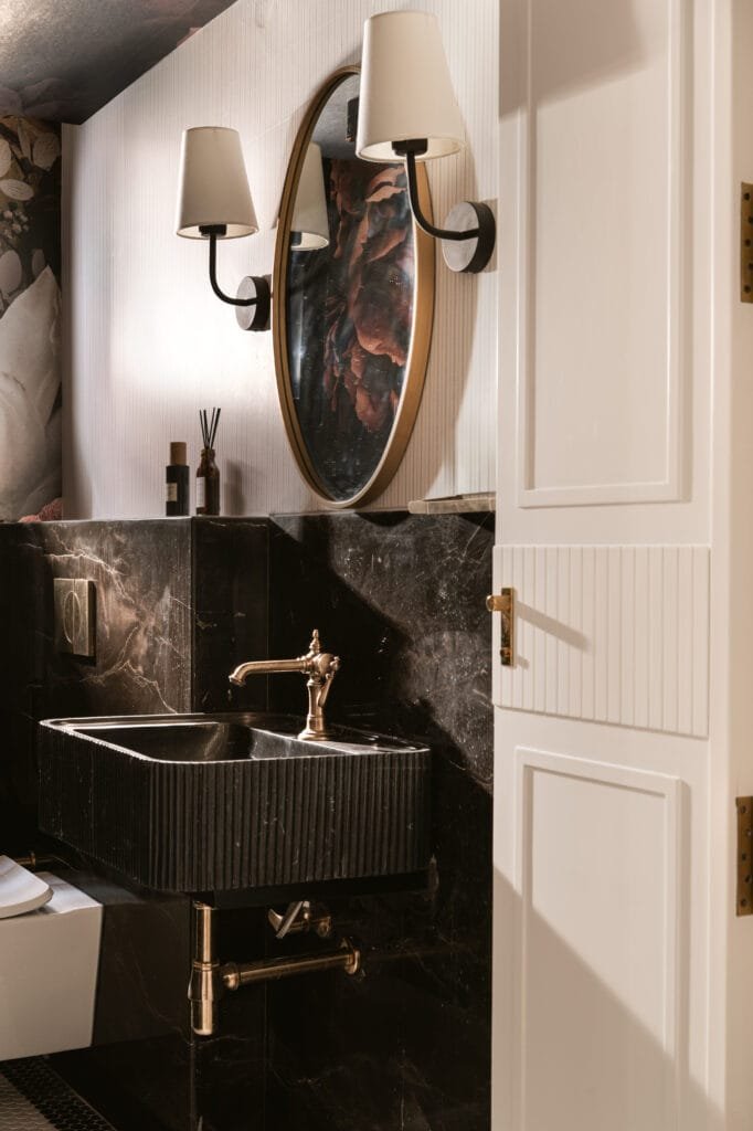 “The master bedroom is an oasis in itself and takes our clients’ love for the colour green to another level, using it in different tones and materials to create a layered but monotone space. The walk-in closet is clad in a William Morris wallpaper and deep teal wardrobes and the bedroom walls are painted a sage green, while the panelled ceiling sports a deep tone of forest green, creating a rich contrast. A large four-poster bed grounds the room. The master bathroom uses deep green tiles all over and a green marble to create a cut-out sink to create a monotone luxe feel,” says Vinithra Amarnathan