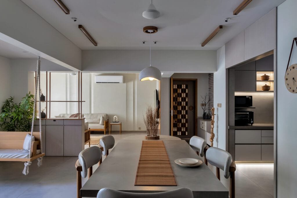 Lighting, too, plays a meditative role. A single pendant glows softly in the corner, while linear wooden light bands trace the ceiling with understated precision. Together, they cast a warm, ambient glow that heightens the room’s contemplative mood.