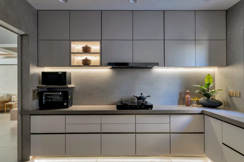 This Wabi-Sabi kitchen is a study in restrained elegance—where soft grey surfaces, seamless cabinetry, and gentle lighting come together to create a space that feels more like a sanctuary than a workspace. Warm clay vessels glow in recessed niches, grounding the room in tradition, while a single plant rises from a stone-like vessel, adding a quiet breath of nature. A kitchen for slow rituals, mindful pauses, and the simple beauty of everyday life.