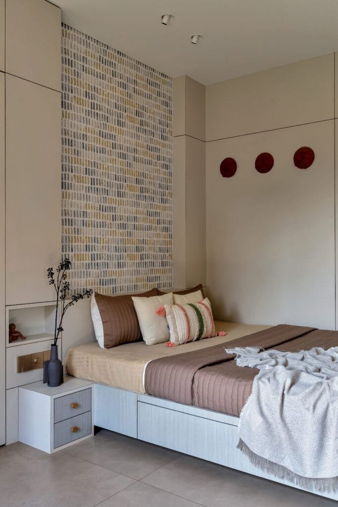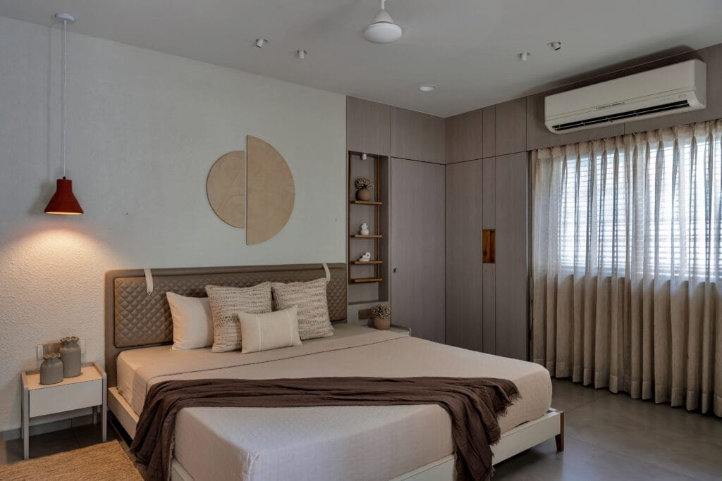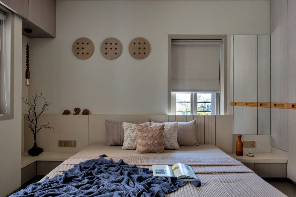Guest bedroom, Soft beige palette sets a peaceful mood, while knitted cushions. Minimal wooden accents, clay figurines, and organic wall art celebrate the beauty of simplicity.
