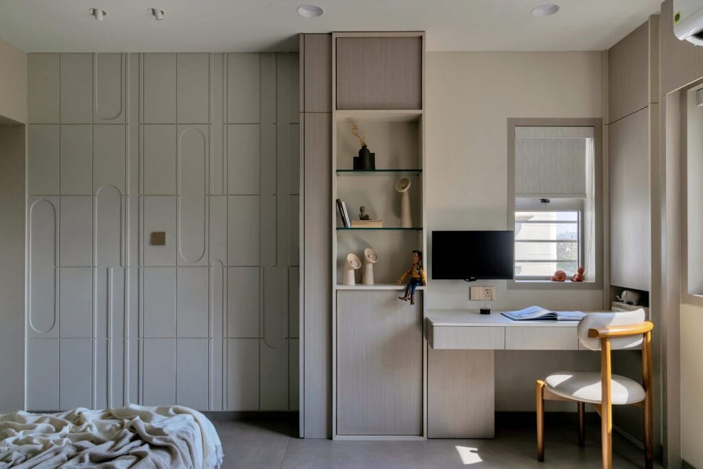 This children’s bedroom blends soft neutrals, natural textures, and handcrafted accents to create a peaceful, nurturing space. Minimal cabinetry and a clean study nook keep the room functional yet uncluttered, while subtle patterns and cozy bedding add warmth.