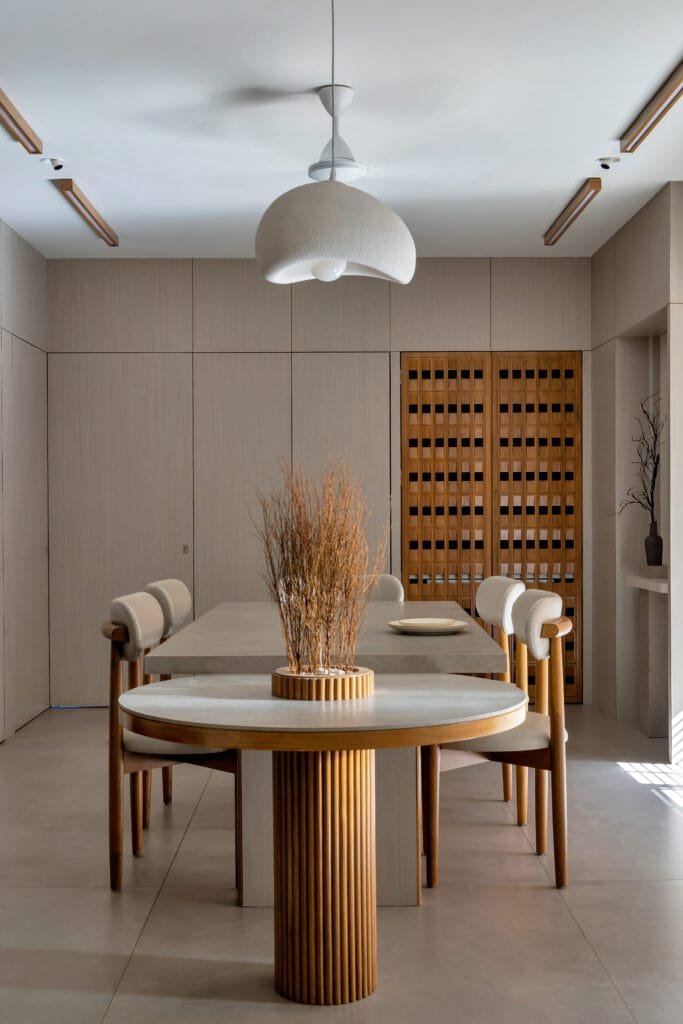 This dining space embraces the poetry of Wabi-Sabi through its warm neutrals, natural textures, and serene minimalism. Soft daylight washes across fluted wooden details, stonefinished surfaces, and gently panelled walls, creating an atmosphere that feels calm and timeless. A sculptural pendant lamp and an understated botanical arrangement bring organic softness, while the illuminated niche adds a touch of contemplative spirituality. Every element is intentional—crafted to evoke balance, authenticity, and the quiet luxury of living simply.