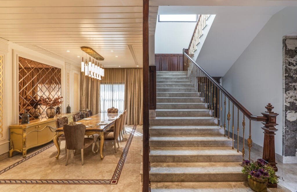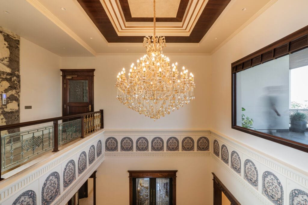 Stepping indoors, the living area, akin to a grand mansion, welcomes one with its double-height space and ornate mouldings. The Italian flooring, textured paints and metallic accents in wall decor evoke a luxurious atmosphere, infusing glamour and sophistication. Here, a mix of tufted sofas and classical curves blend modern functionality with timeless aesthetics, making it perfect for gatherings and conversations. Maintaining a balanced layout and symmetry hallmarks classical design as elements like aligned doorways, framed windows, and harmonised proportions create a visual continuity.