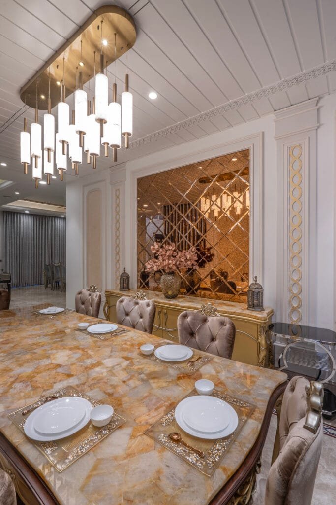 Transitioning to the dining area, the layout follows an open plan, connecting the kitchen and living areas. Suspended pendant lights paired with soft wall scones cast a warm glow. Golden-tinted mirrors on walls and classical column design add a layer of sophistication. Antique frames are incorporated into wall panels to amplify light and enhance the spatial experience.