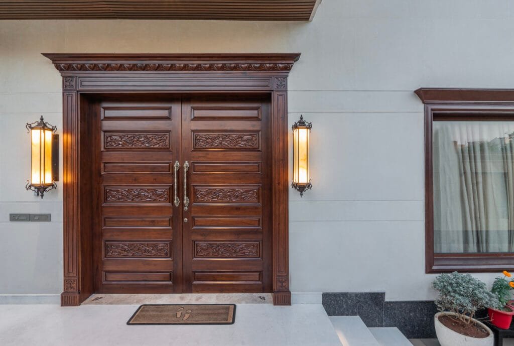 The facade design is a key architectural feature, embodying the client’s desire for a modern aesthetic infused with classical detailing. Its combination of natural materials like mint stone and brown stone, coupled with intricate mouldings and grand proportions, ensured a striking and timeless appearance. Mint stone is the primary material used in the facade cladding, providing a natural, soothing hue that harmonises with the surroundings. On the other hand, the brown stone is used as an accent material for plinths, base cladding, and borders to contrast the mint stone and add warmth.