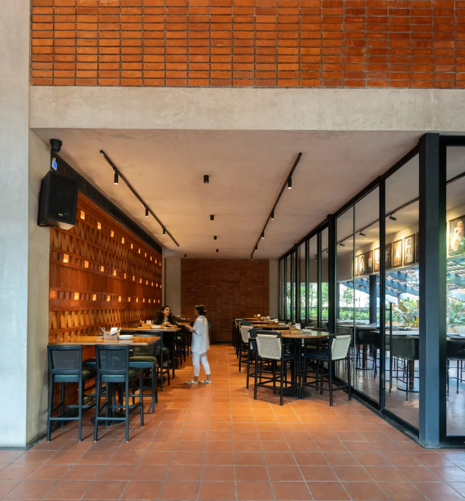 The site is located in Jubilee Hills road no 45, the sought after address for most of the high-end restaurants and clubs in the city of Hyderabad. The challenge was in crafting a vernacular material palette that reflected a refined sophisticated look, while at the same time valuing elegance in every facet of life. The site, bordered by commercial buildings on both sides and a community park at the rear, features a concrete-steel composite structure with ground plus two floors and an intermediate mezzanine level within the triple-height space.