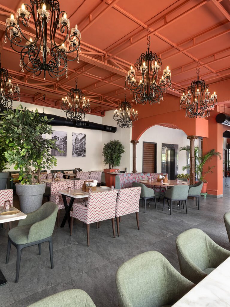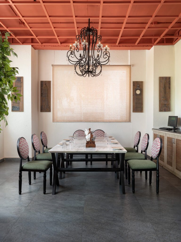 The design balances its old identity with the new one. Elements such as the tiled flooring and exposed ceiling have been thoughtfully retained to establish a sense of continuity, while a warm terracotta tone–referencing Kanpur’s famed heritage: Lal Imli Mill–now envelopes the ceiling, lending the space a sense of warmth and quiet invitation. “We chose a hue that complemented the lush greenery outside while also anchoring the interiors in a grounded palette. It allowed the space to feel renewed without losing its character,” shares Pooja.