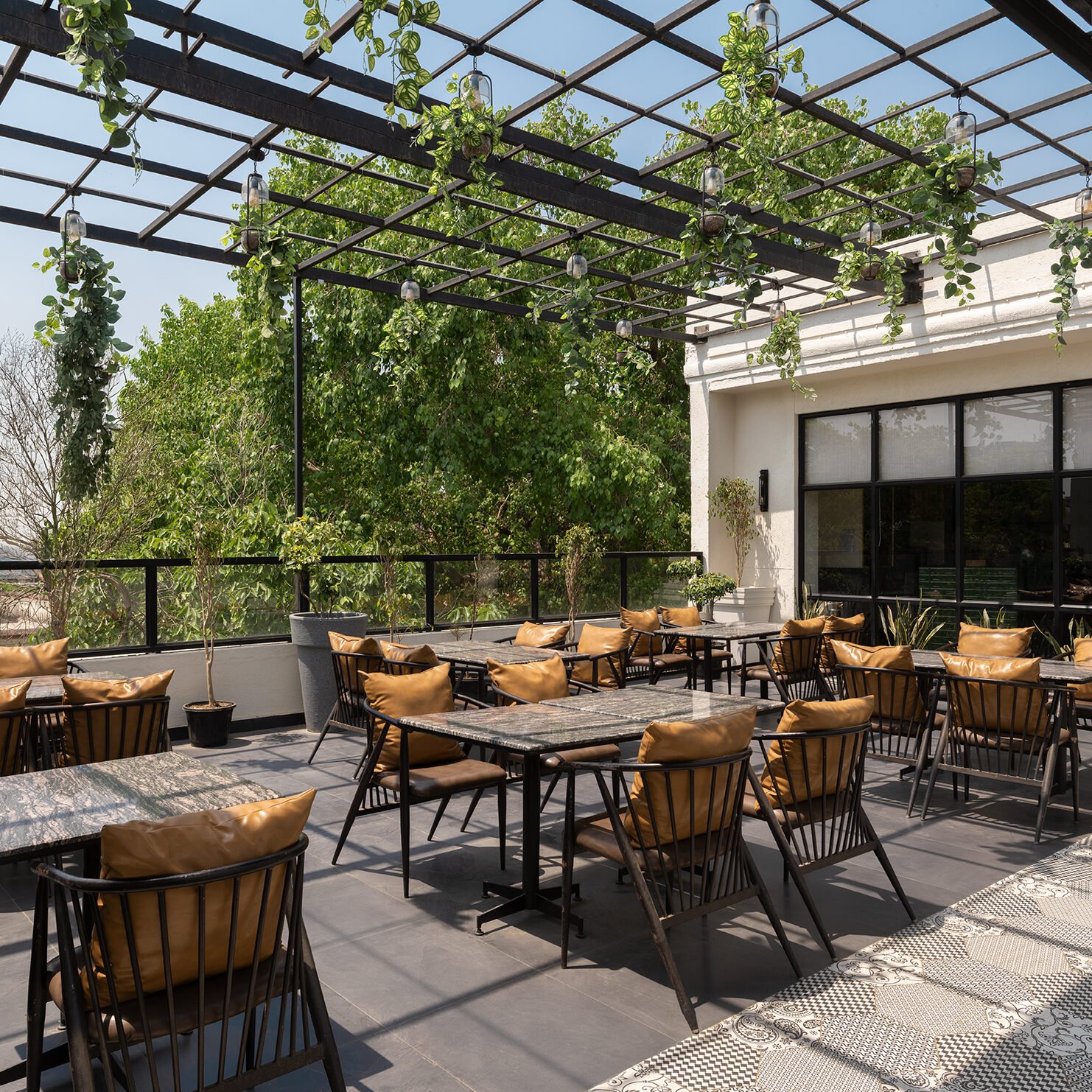 The terrace offers a quieter shift from the more traditionally detailed interiors. Black pergola, stone-top tables, minimal chairs and hanging plants soften the mood, as the day eases into evenings. It invites leisurely meals and unhurried conversations with the views of the city.