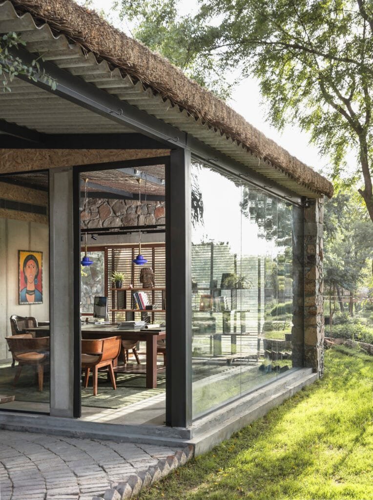 The material palette enables easy correlation to nature and is sourced within a 200-250 km radius of the site, reducing carbon emissions incurred during transportation. The simple, low-rise blocks feature dressed rubble stone masonry walls that seamlessly blend in with the natural surroundings. The thatched roof, a part of northern India’s design vocabulary, is integrated with the studio block’s morphology by local artisans and helps maintain comfortable internal temperatures.