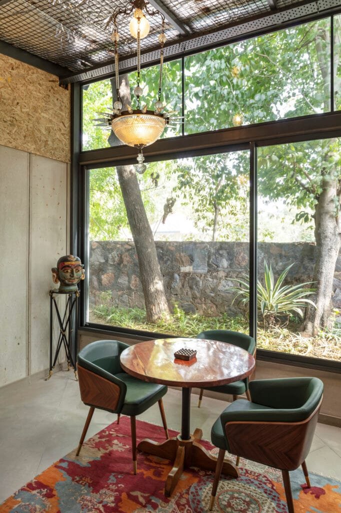Untouched by urbanisation in the Gwal Pahari area, the verdant 19,046 sq. ft. property provides respite from the chaos of the city and is conveniently accessible from both New Delhi and Gurugram. The design adopts a fragmented scheme with smaller, distinct blocks with an outward-looking approach, each crafted with a unique character and function. This layout weaves through the landscape, creating a journey of exploration and a sequence of experiential spaces that meld into the surroundings.
