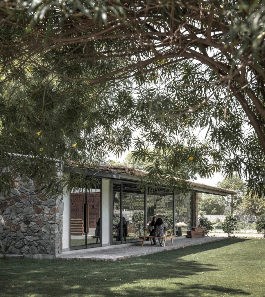 Explaining the finer details, Amit Aurora adds, “Terracotta brick flooring enhances the connection to the natural setting. It also cools down the space, working on the same principle as an earthen pot when sprinkled with water. It forms a harmonious composition with the loose gravel, or Bajri, and the green lawns that enable water percolation to maintain the groundwater levels. Aero concrete panels, which interlock with each other and allow quick on-site assembly, are expressed in their raw grey texture and contribute to the scheme’s frugal palette.”