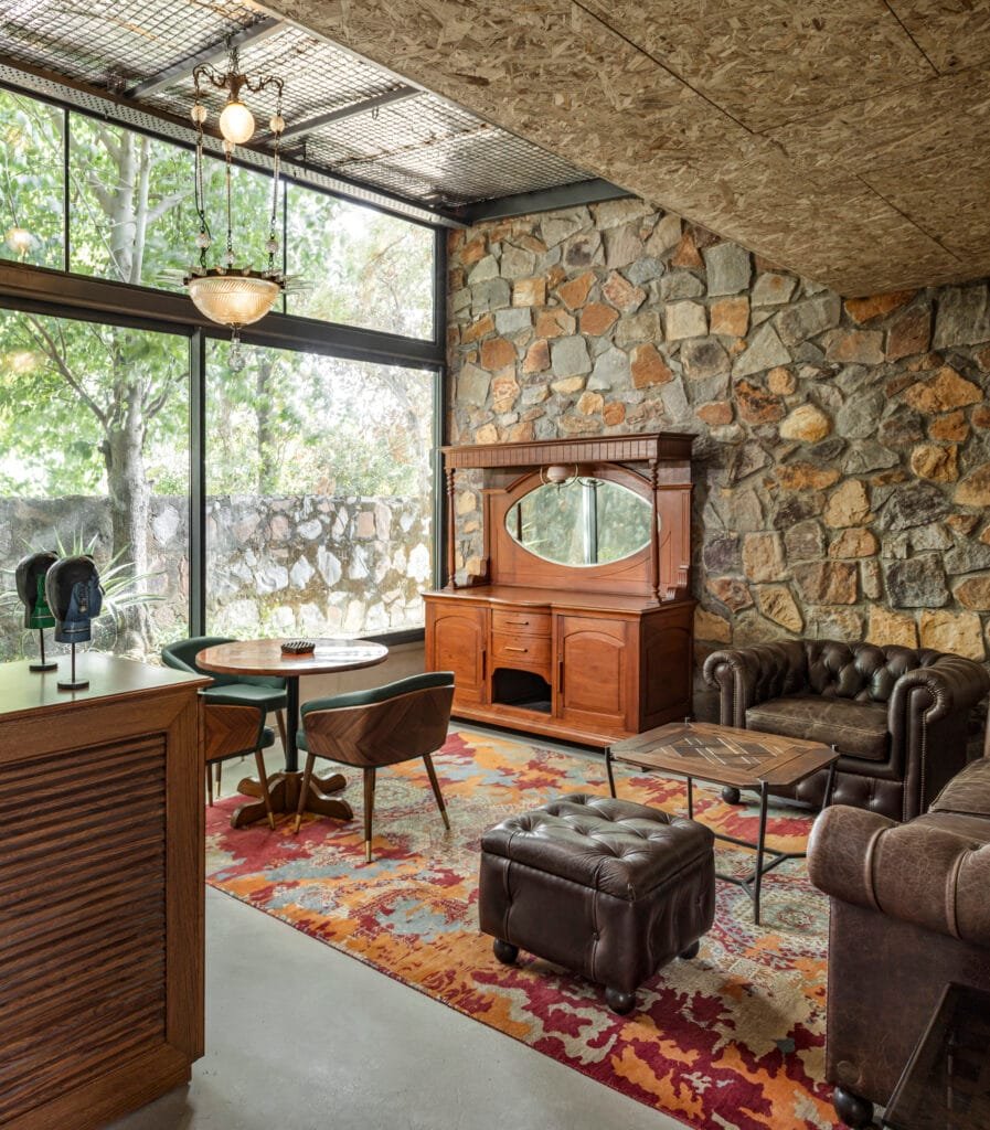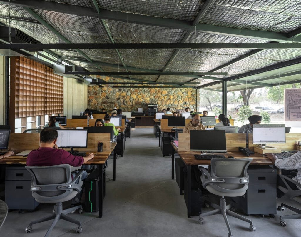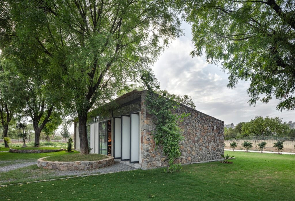 The layout comprises four rectangular blocks of varying footprints that house functions like the reception area, meeting rooms, workstations, principal architects’ offices, administrative department, cafeteria, etc., intertwined with lush lawns and shaded under the dense canopies of trees, embodying an optimistic setting that promotes the team’s passion for design, the spirit of collaboration, inspiration from nature, etc. All the blocks respond to the principles of climatology and Vastu. Oriented along the East-West axis, the blocks are constructed with dressed rubble masonry to shield the interiors from the harsh sunlight. While all the north-facing walls are porous and adorn large, glazed windows that open onto the shaded verandahs, the southern walls have small fenestrations that modulate heat and glare. These design strategies ensure the studio is unaffected by the scorching summers while welcoming the gentle winter sun, furnishing the space with diffused natural light that promotes clear thinking and frames refreshing views. Along with the well-insulated roofs, walls, and surrounding greens, the studio embraces the simplicity of nature to cultivate a serene workspace. A winding entrance leads to the reception block, connected to two meeting rooms. The humble scale and intimate heights establish an immediate, welcoming connection with visitors, creating an illusion of a small studio space. The second block accommodates administrative functions, a materials studio, a staff cafeteria, a stationery store, an accounting office, and a pantry near the reception. The principal cabins are a separate entity, visually connected to the studio and the ecstatic views outdoors. There is a multi-purpose lounge that forms a buffer between both principal offices. This space is where meetings and brainstorming sessions happen; it also caters to clients for entertainment or even a space to host friends. This thoughtful design strategy allows for discussions to extend into the principal’s cabin and simultaneously provides autonomy to the team. The fourth block, and the largest of all, houses the workstations for the staff adjacent to a presentation room for client meetings. Basking in the quiet rear end of the site, the studio block spills into the outdoors on one side, with an overhang that shades the glazed facade and creates a buffer, perfect for brainstorming, some alone time, or a cup of coffee during the rains. Small shading devices on the opposite facade cut the harsh sun and filter in fresh air.