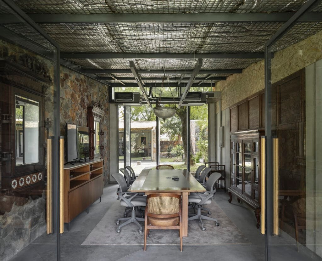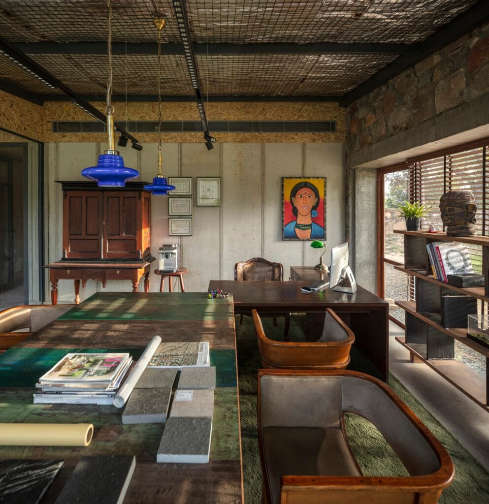 With a tapestry of textures and memorabilia, the interiors reflect the workspace’s reigning theme of simplicity and simultaneously celebrate Indian heritage. Repurposed from the previous office, intended to carry forward the DCA ethos, each collectable carries the essence of the practice and nostalgia into the new workspace. Ornately carved wooden columns sourced from an old demolished Mangalore house support the principal cabin’s roof at the entrance, emulating a traditional home’s verandah. Eighty-year-old blue-coloured British lights cast a subdued glow in the space within. The central table in the room is composed of a combination of doors from various Mangalore homes that are a century old with diverse patinas, resulting in an object rich in texture and colour. Even the table in the principal office is left raw, in its unpolished manner, reflecting an old charm from the inception time of the firm. The office is populated with memorabilia and the associated stories, allowing each individual to personalise their setting and celebrate the team’s collective spirit.