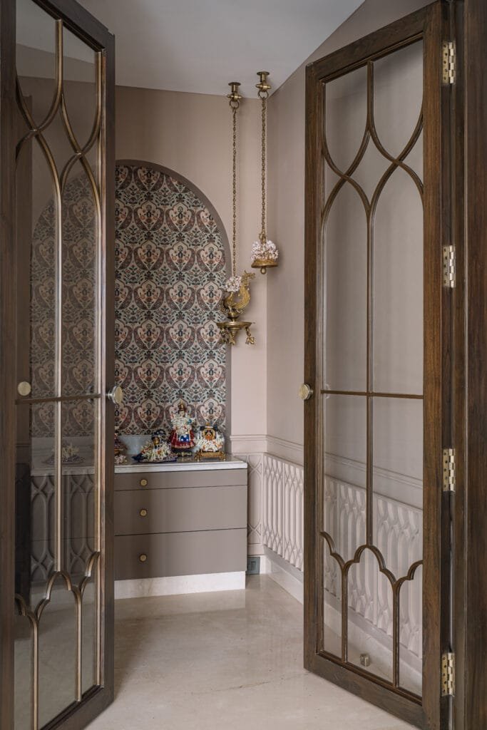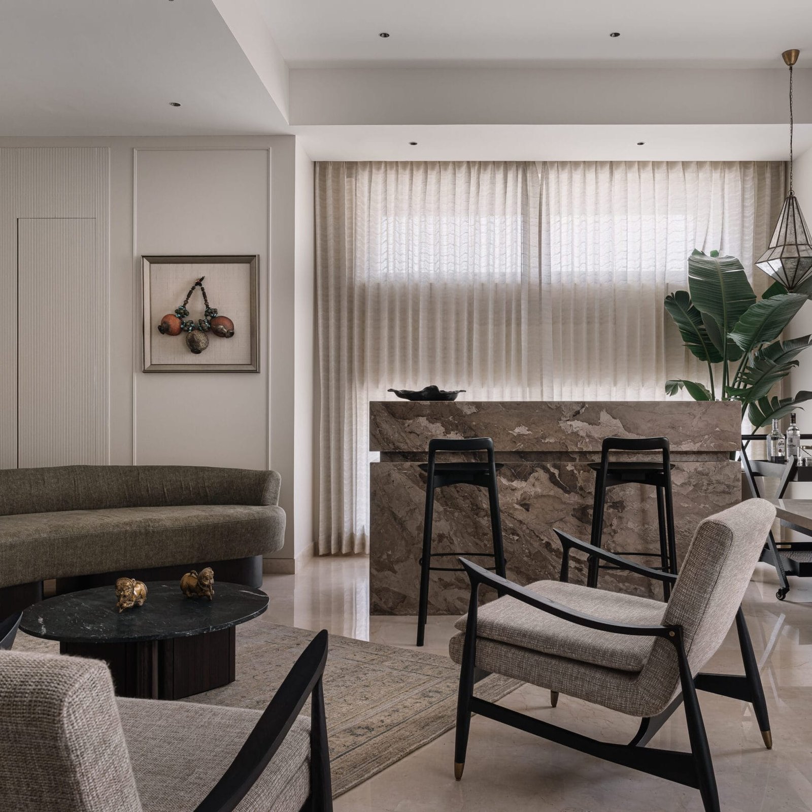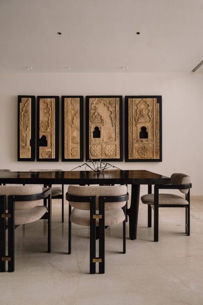 “The clients came to us with a clear vision, they wanted something warm, grounded and understated,” shares Santosh Belani, Principal Designer and Co-Founder, Studio GSA, which she leads alongside Gaurav Panjwani. That intention takes shape right from the entrance. As you step through the charcoal-panelled door into the quiet, minimal foyer, it is the soft natural light that draws your attention first – filtering in from the tall double-height windows at the far end. In this gentle light, the space begins to reveal itself. Warm wood, carved stone details, soft fabric, and graphical marbles come together in quiet conversation to shape a muted palette of browns and neutrals.