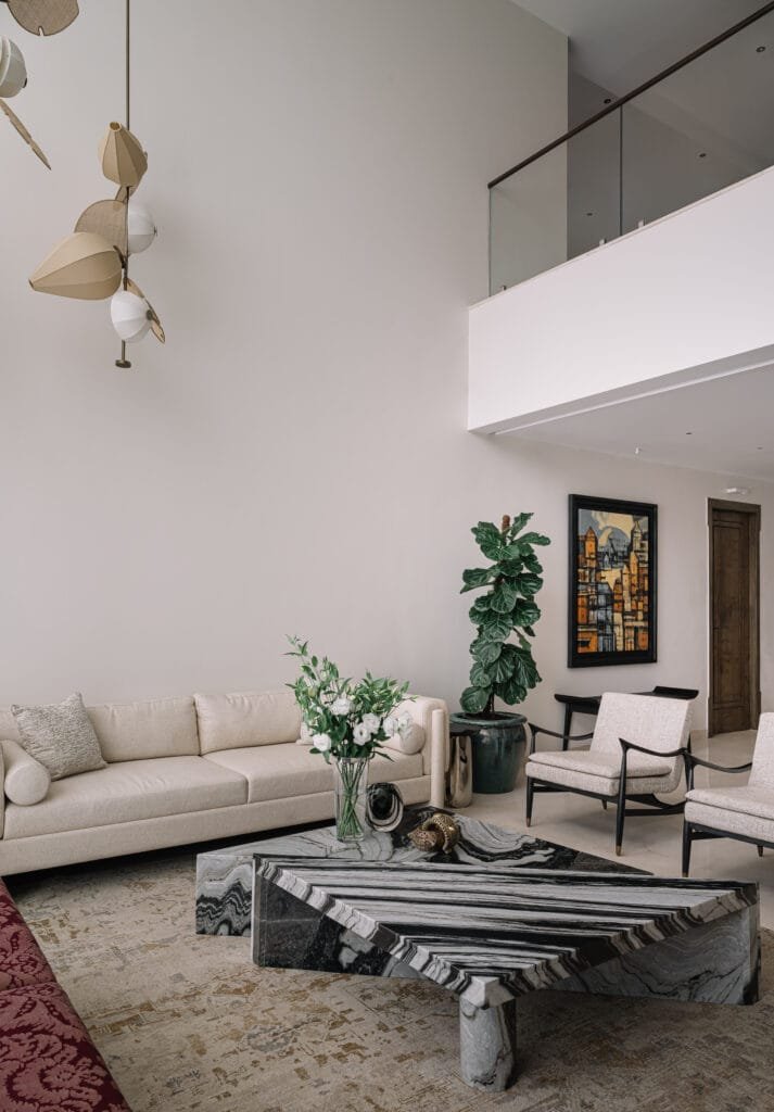 Just beyond, the dining area opens up – nestled within a single-height volume that retains a sense of intimacy. A live-edge wooden table anchors the space with its sculptural presence. It is flanked by detailed stone panels on one side and a pair of minimal credenzas on the other. The space comes alive when the family entertains, often becoming the centre of activity before guests spill into the formal living room ahead, where the ceiling lifts into a soaring double-height volume. Here, the tall fenestrations glimpsed at the entry take center stage, flooding the interiors with light and framing outdoor views. A richlyveined marble table anchors the space – bold and expressive against an otherwise quiet composition. Neutral linen sofas and armchairs line the periphery, encouraging comfort and conversation.