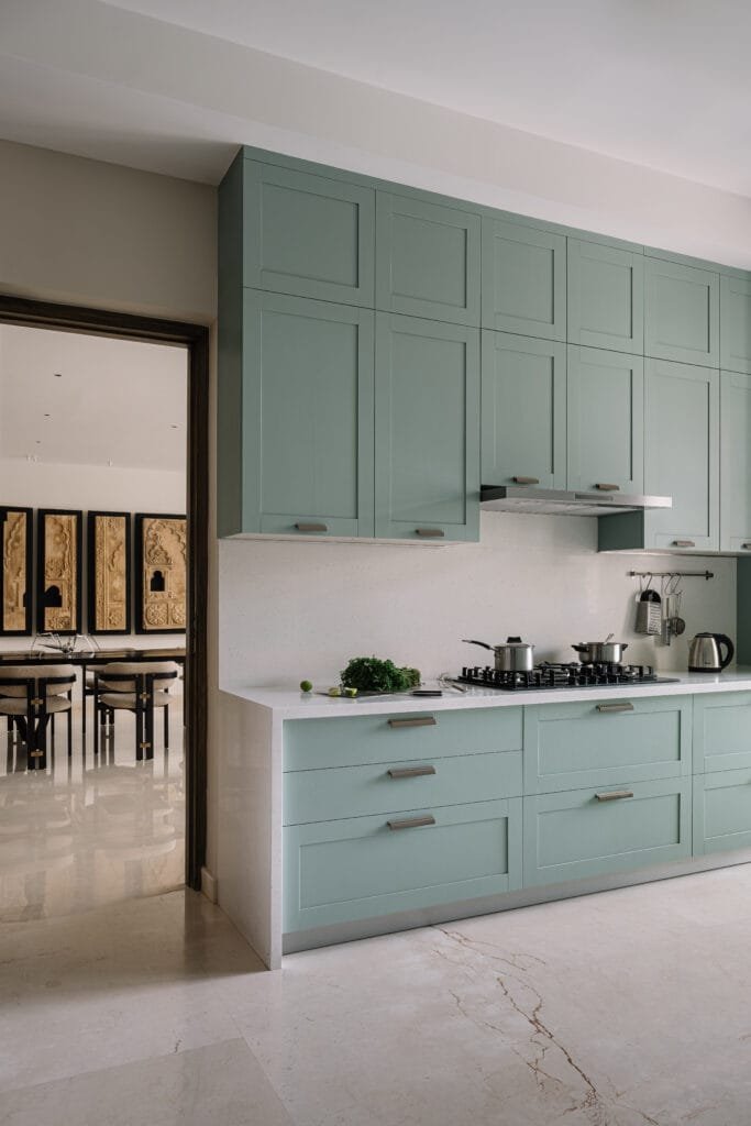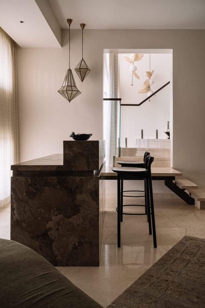 To one side of the room, a panelled passage leads into a cosy lounge and bar imagined for unwinding. A deep green sofa sits against walls framed with mouldings, adding vibrance to the otherwise simple palette. The staircase begins here, its lower steps doubling as extra seating before slipping through a wall cutout – a quiet threshold between the lounge and the living. A monolithic stone bar stands beside it – grounding yet unobtrusive.