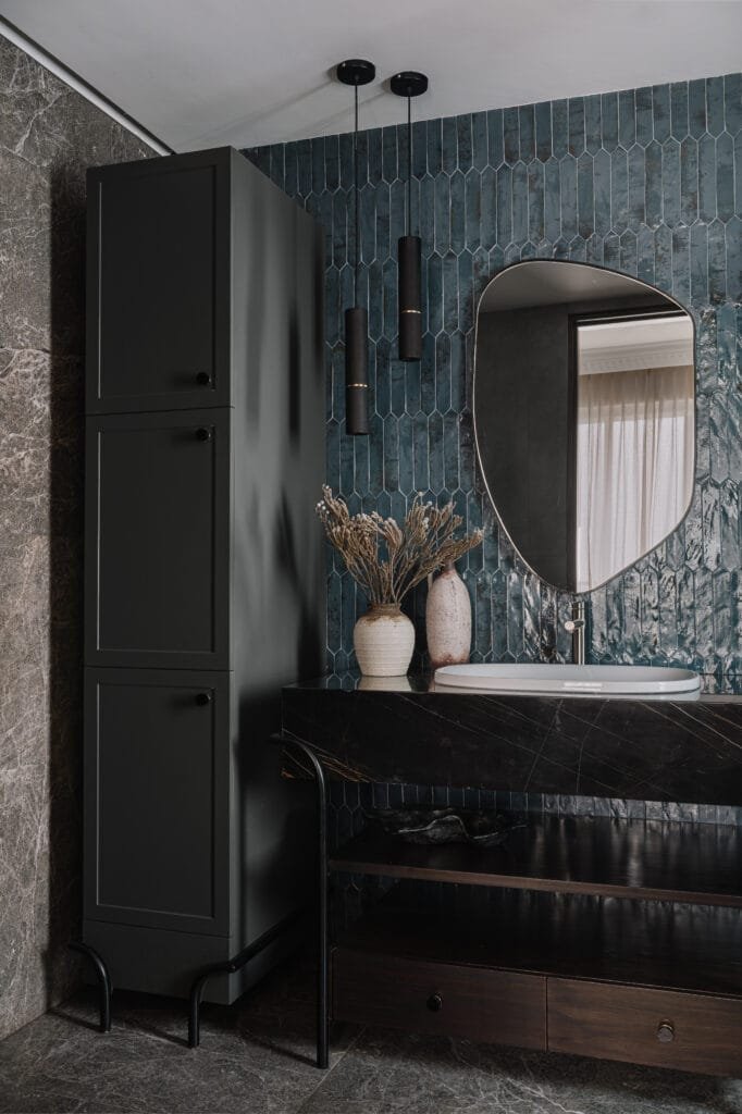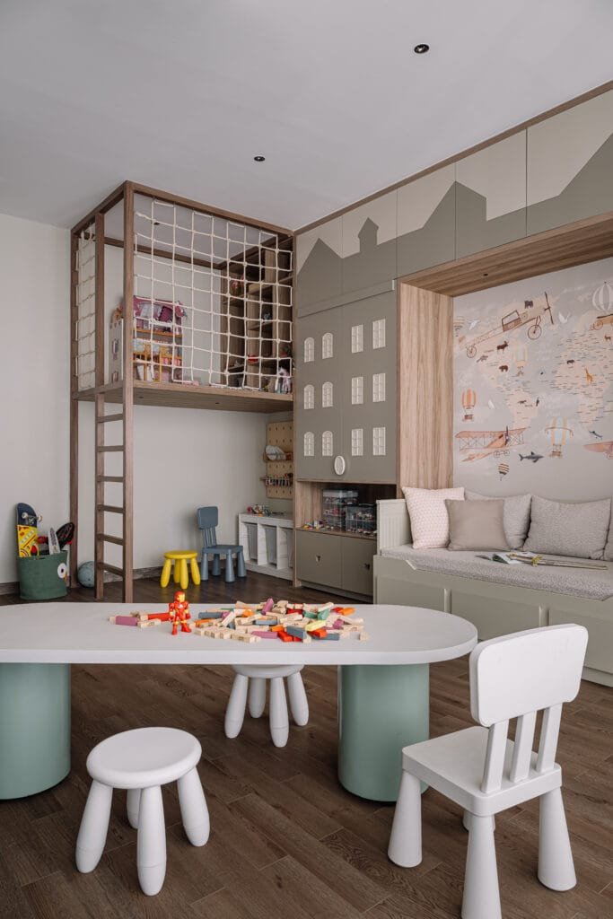 The passage leads into a series of tuckedaway spaces – a wine cellar, a store room and a powder room layered with dark, rich textures. At the end, two doors lead into the guest bedroom and the children’s playroom. The former is a calm retreat, where a charcoal-toned wooden bed pairs with brass-detailed side tables and textured fabrics. The playroom, meanwhile, includes an activity table, bunk bed, and resting nook – all set within the home’s muted palette, but brightened by playful bursts of colour. It is a space for movement, imagination, and moments of unstructured joy.