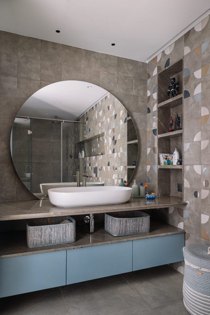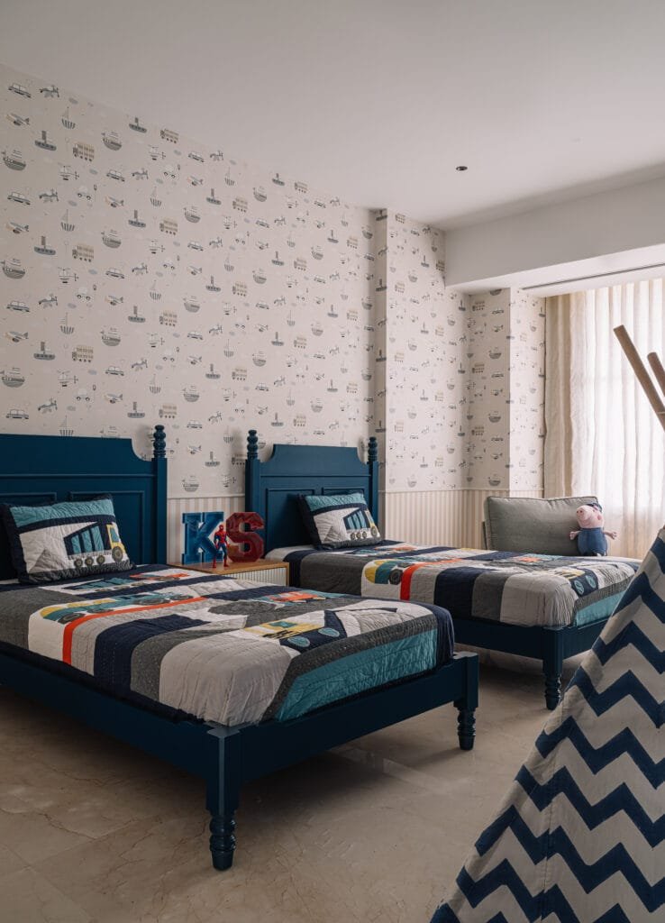 Upstairs, the private quarters unfold. A family lounge in wooden flooring, furnished with cozy couches and layered with memorabilia, sets a relaxed tone. The twin boys’ bedroom features twin beds, vibrant textures, and a vehicle-themed wallpaper, all anchored in a soothing blue palette. Their washroom features geometric tiles that echo the room’s energy. The daughter’s room is rendered in soft pink accents through a floral wallpaper, upholstered bed, and cane details. Her bathroom continues the theme with floral tiles. Each space reflects the children’s personalities while allowing room to grow.